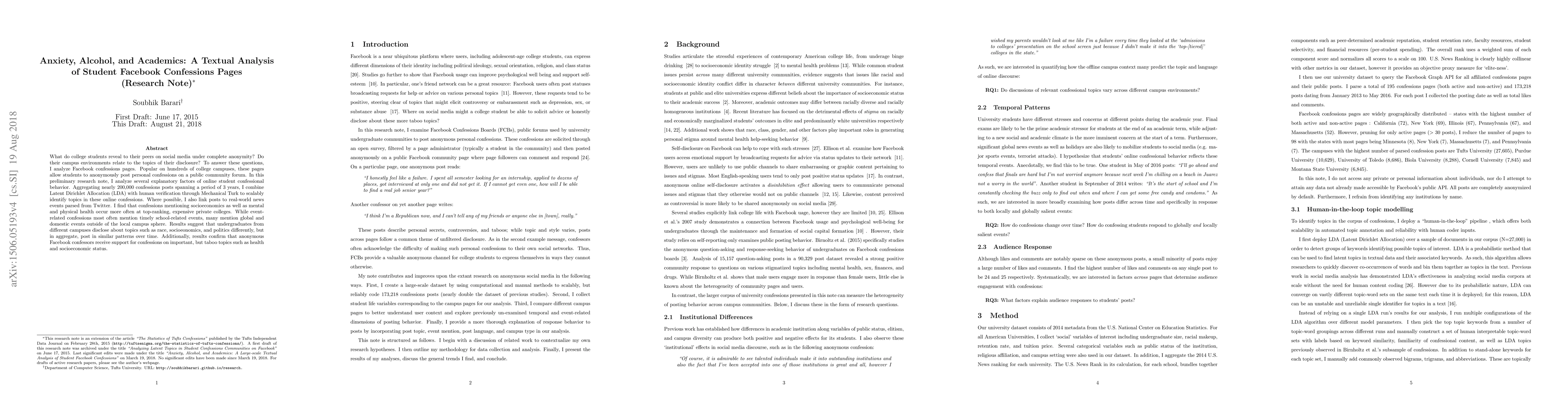 What do college students reveal to their peers on social media under complete anonymity? Do their campus environments relate to the topics of their disclosure? To answer these questions, I analyze Facebook confessions pages. Popular on hundreds of college campuses, these pages allow students to anonymously post personal confessions on a public community forum. In this preliminary research note, I analyze several explanatory factors of online student confessional behavior. Aggregating nearly 200,000 confessions posts spanning a period of 3 years, I combine Latent Dirichlet Allocation (LDA) with human verification through Mechanical Turk to scalably identify topics in these online confessions. Where possible, I also link posts to real-world news events parsed from Twitter. I find that confessions mentioning socioeconomics as well as mental and physical health occur more often at top-ranking, expensive private colleges. While event-related confessions most often mention timely school-related events, many mention global and domestic events outside of the local campus sphere. Results suggest that undergraduates from different campuses disclose about topics such as race, socioeonomics, and politics differently, but in aggregate, post in similar patterns over time. Additionally, results confirm that anonymous Facebook confessors receive support for confessions on important, but taboo topics such as health and socioeconomic status.
