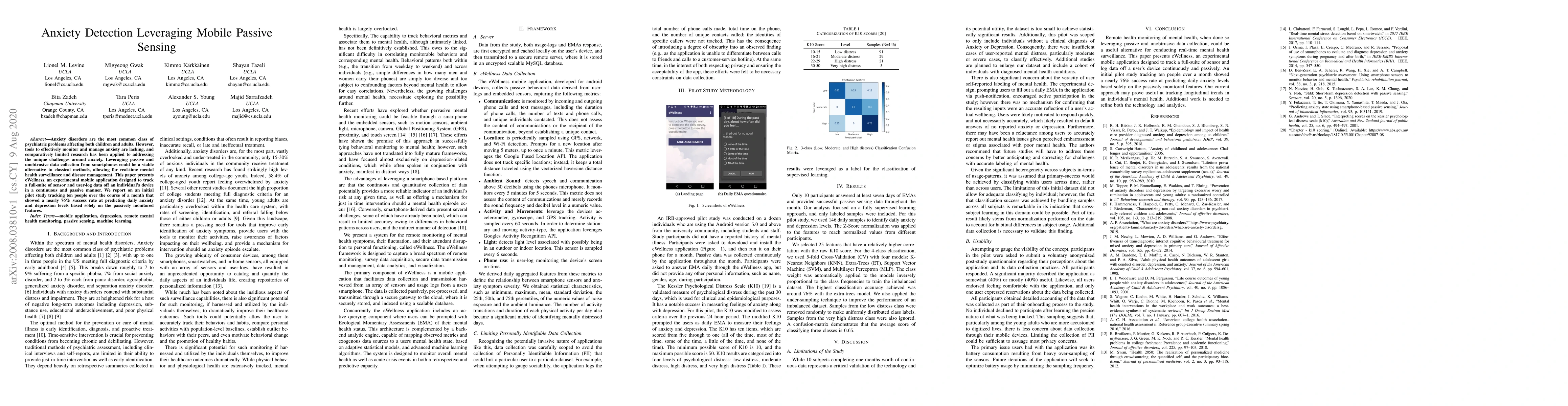 Anxiety disorders are the most common class of psychiatric problems affecting both children and adults. However, tools to effectively monitor and manage anxiety are lacking, and comparatively limited research has been applied to addressing the unique challenges around anxiety. Leveraging passive and unobtrusive data collection from smartphones could be a viable alternative to classical methods, allowing for real-time mental health surveillance and disease management. This paper presents eWellness, an experimental mobile application designed to track a full-suite of sensor and user-log data off an individual's device in a continuous and passive manner. We report on an initial pilot study tracking ten people over the course of a month that showed a nearly 76% success rate at predicting daily anxiety and depression levels based solely on the passively monitored features.