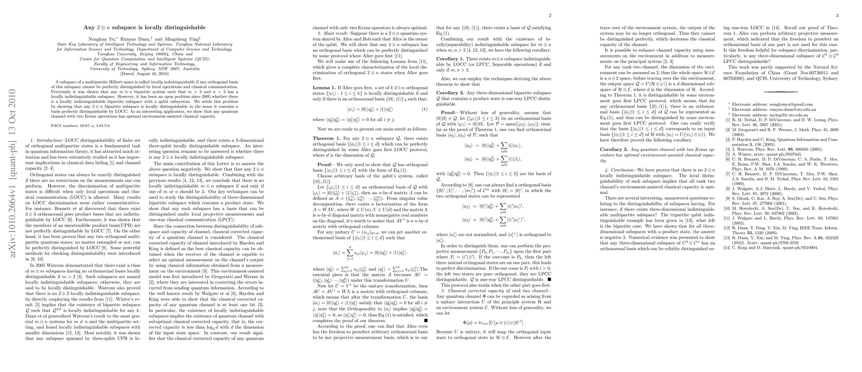 A subspace of a multipartite Hilbert space is called \textit{locally indistinguishable} if any orthogonal basis of this subspace cannot be perfectly distinguished by local operations and classical communication. Previously it was shown that any $m\otimes n$ bipartite system such that $m>2$ and $n>2$ has a locally indistinguishable subspace. However, it has been an open problem since 2005 whether there is a locally indistinguishable bipartite subspace with a qubit subsystem. We settle this problem by showing that any $2\otimes n$ bipartite subspace is locally distinguishable in the sense it contains a basis perfectly distinguishable by LOCC. As an interesting application, we show that any quantum channel with two Kraus operations has optimal environment-assisted classical capacity.