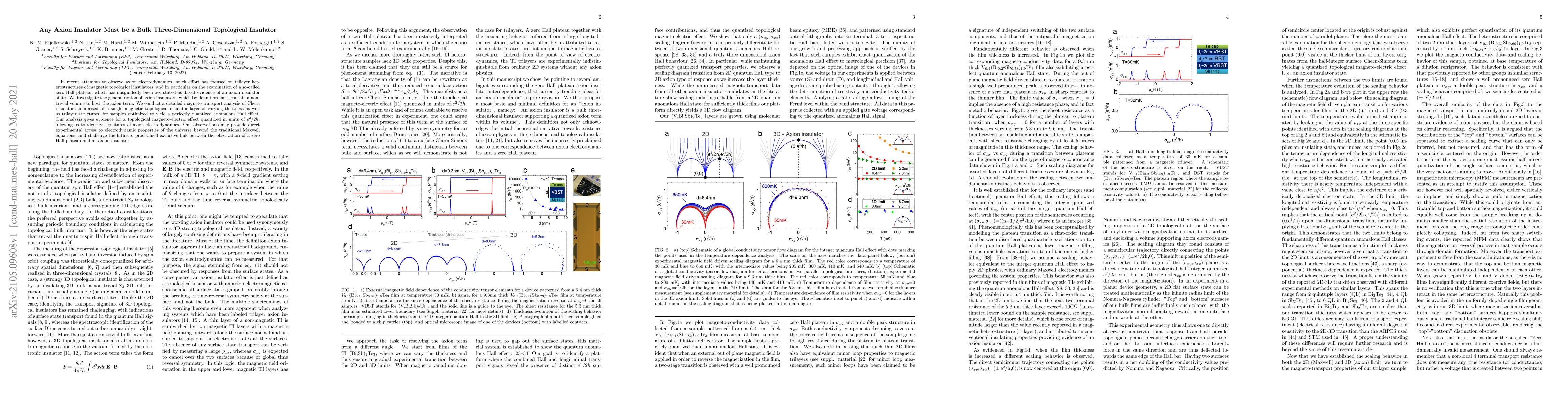 In recent attempts to observe axion electrodynamics, much effort has focused on trilayer heterostructures of magnetic topological insulators, and in particular on the examination of a so-called zero Hall plateau, which has misguidedly been overstated as direct evidence of an axion insulator state. We investigate the general notion of axion insulators, which by definition must contain a nontrivial volume to host the axion term. We conduct a detailed magneto-transport analysis of Chern insulators comprised of a single magnetic topological insulator layer of varying thickness as well as trilayer structures, for samples optimized to yield a perfectly quantized anomalous Hall effect. Our analysis gives evidence for a topological magneto-electric effect quantized in units of e$^2$/2h, allowing us to identify signatures of axion electrodynamics. Our observations may provide direct experimental access to electrodynamic properties of the universe beyond the traditional Maxwell equations, and challenge the hitherto proclaimed exclusive link between the observation of a zero Hall plateau and an axion insulator.