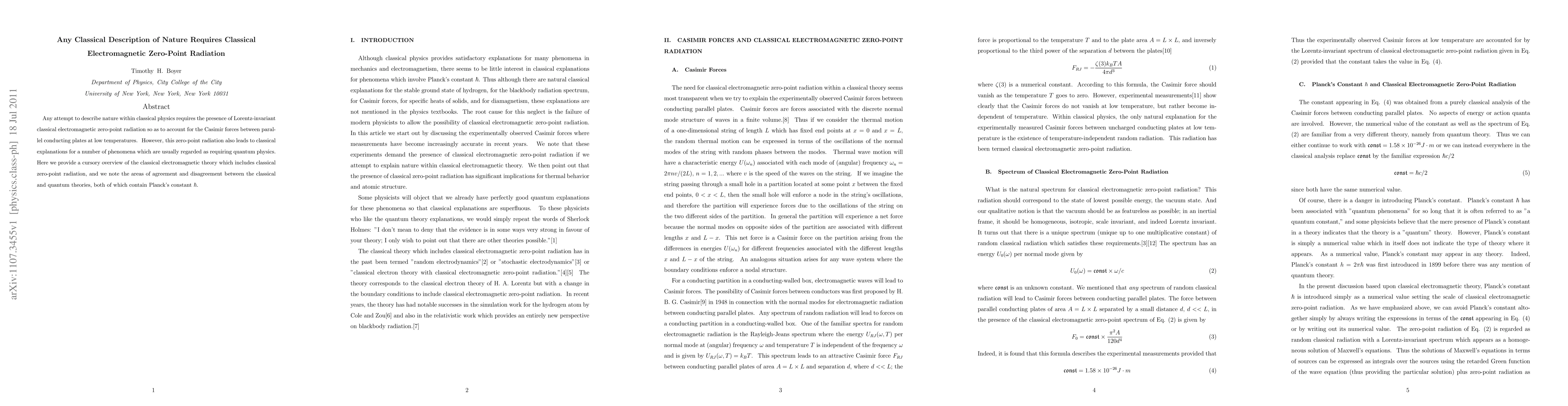 Any attempt to describe nature within classical physics requires the presence of Lorentz-invariant classical electromagnetic zero-point radiation so as to account for the Casimir forces between parallel conducting plates at low temperatures. However, this zero-point radiation also leads to classical explanations for a number of phenomena which are usually regarded as requiring quantum physics. Here we provide a cursory overview of the classical electromagnetic theory which includes classical zero-point radiation, and we note the areas of agreement and disagreement between the classical and quantum theories, both of which contain Planck's constant h.