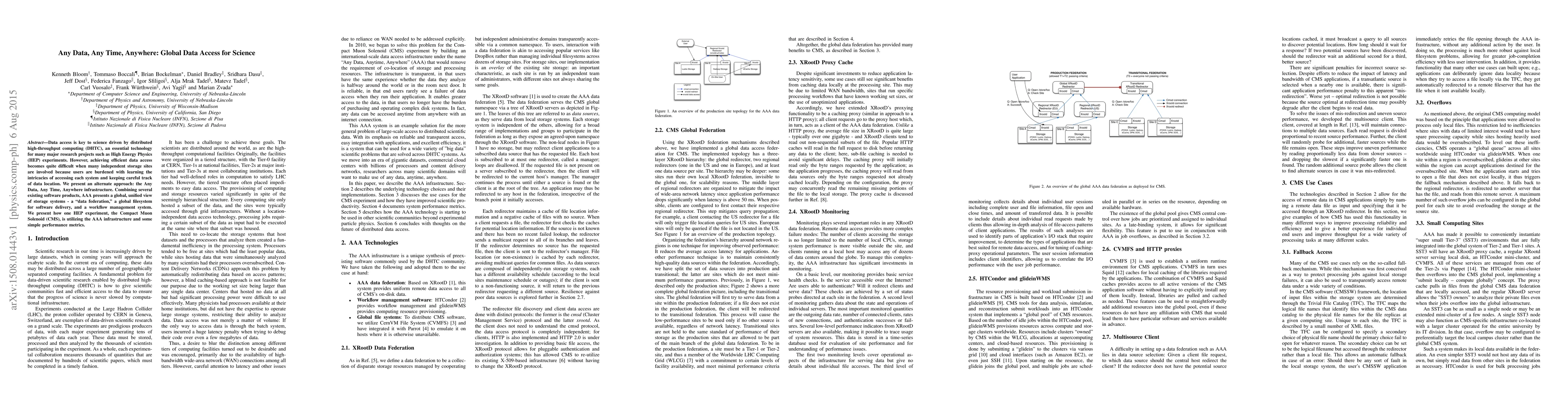 The paper proposes the "Any Data, Any Time, Anywhere" (AAA) infrastructure to simplify global data access in distributed high-throughput computing, particularly for High Energy Physics experiments. AAA integrates existing software to create a unified global filesystem and workflow management system, exemplified by its use in the Compact Muon Solenoid experiment.