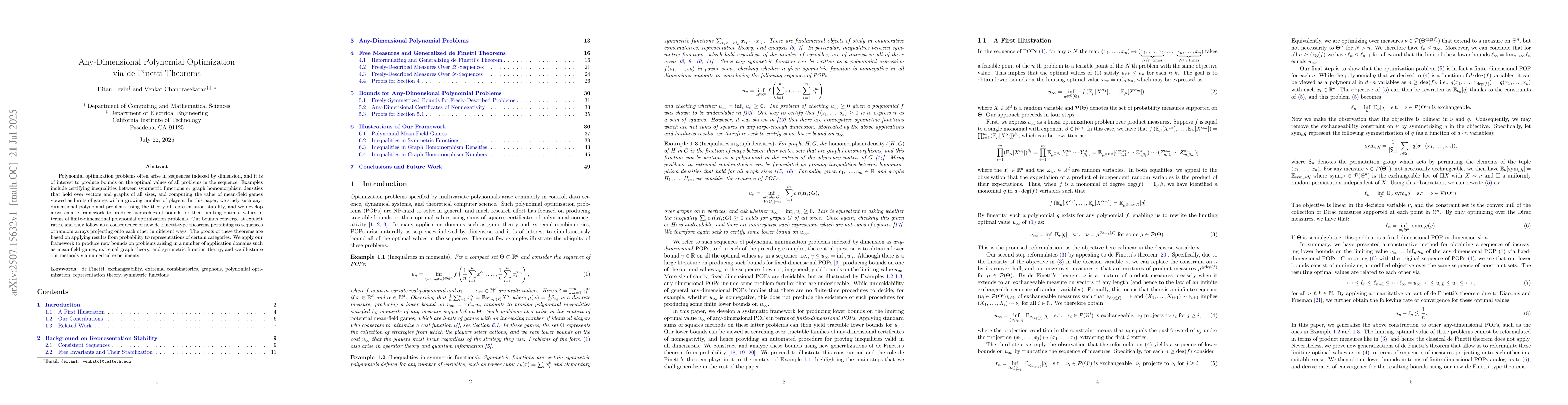Polynomial optimization problems often arise in sequences indexed by dimension, and it is of interest to produce bounds on the optimal values of all problems in the sequence. Examples include certifying inequalities between symmetric functions or graph homomorphism densities that hold over vectors and graphs of all sizes, and computing the value of mean-field games viewed as limits of games with a growing number of players. In this paper, we study such any-dimensional polynomial problems using the theory of representation stability, and we develop a systematic framework to produce hierarchies of bounds for their limiting optimal values in terms of finite-dimensional polynomial optimization problems. Our bounds converge at explicit rates, and they follow as a consequence of new de Finetti-type theorems pertaining to sequences of random arrays projecting onto each other in different ways. The proofs of these theorems are based on applying results from probability to representations of certain categories. We apply our framework to produce new bounds on problems arising in a number of application domains such as mean-field games, extremal graph theory, and symmetric function theory, and we illustrate our methods via numerical experiments.