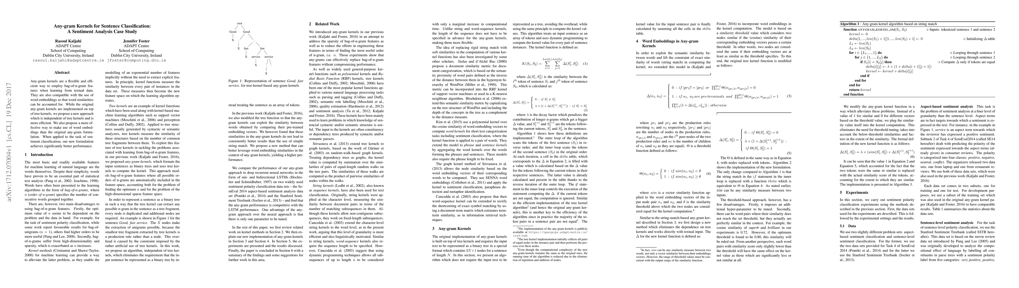 This paper proposes a new efficient any-gram kernel method for sentence classification, independent of tree kernels, and improves the use of word embeddings. It demonstrates superior performance in sentiment analysis compared to the original any-gram kernels.
