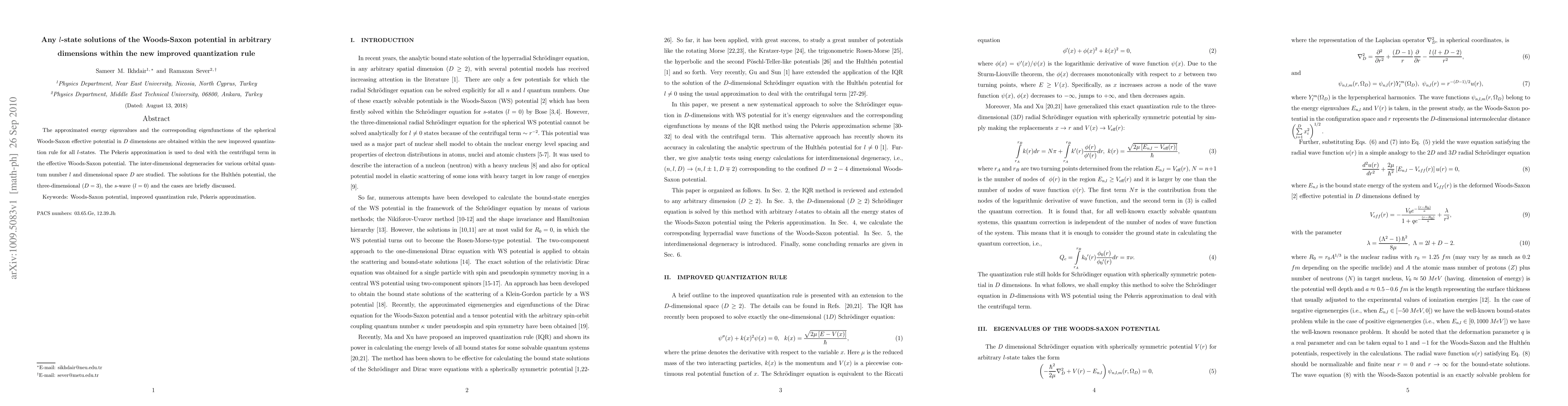 The approximated energy eigenvalues and the corresponding eigenfunctions of the spherical Woods-Saxon effective potential in $D$ dimensions are obtained within the new improved quantization rule for all $l$-states. The Pekeris approximation is used to deal with the centrifugal term in the effective Woods-Saxon potential. The inter-dimensional degeneracies for various orbital quantum number $l$ and dimensional space $D$ are studied. The solutions for the Hulth\'{e}n potential, the three-dimensional (D=3), the $% s$-wave ($l=0$) and the cases are briefly discussed.