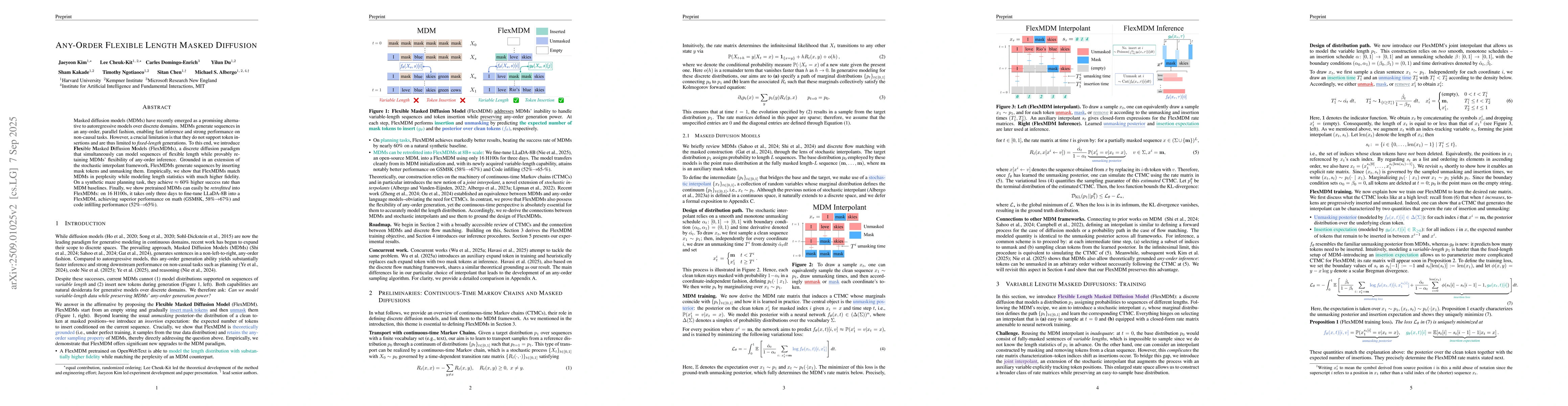 Masked diffusion models (MDMs) have recently emerged as a promising alternative to autoregressive models over discrete domains. MDMs generate sequences in an any-order, parallel fashion, enabling fast inference and strong performance on non-causal tasks. However, a crucial limitation is that they do not support token insertions and are thus limited to fixed-length generations. To this end, we introduce Flexible Masked Diffusion Models (FlexMDMs), a discrete diffusion paradigm that simultaneously can model sequences of flexible length while provably retaining MDMs' flexibility of any-order inference. Grounded in an extension of the stochastic interpolant framework, FlexMDMs generate sequences by inserting mask tokens and unmasking them. Empirically, we show that FlexMDMs match MDMs in perplexity while modeling length statistics with much higher fidelity. On a synthetic maze planning task, they achieve $\approx 60 \%$ higher success rate than MDM baselines. Finally, we show pretrained MDMs can easily be retrofitted into FlexMDMs: on 16 H100s, it takes only three days to fine-tune LLaDA-8B into a FlexMDM, achieving superior performance on math (GSM8K, $58\% \to 67\%$) and code infilling performance ($52\% \to 65\%$).