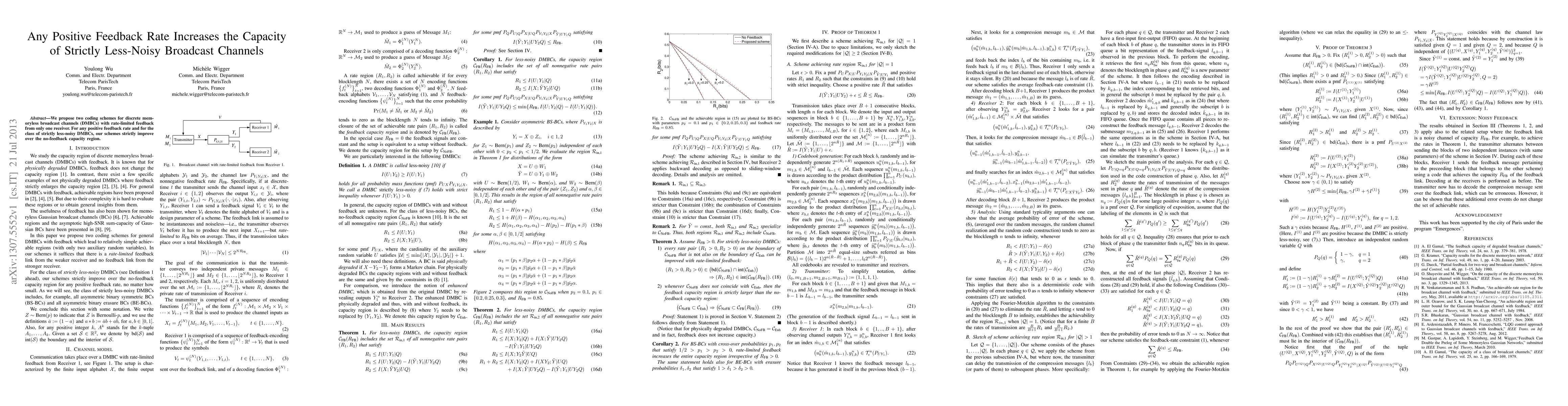 Summary: This paper introduces two coding schemes for discrete memoryless broadcast channels with limited feedback from one receiver, demonstrating that any positive feedback rate can enhance the capacity for strictly less-noisy channels beyond the no-feedback capacity region.
