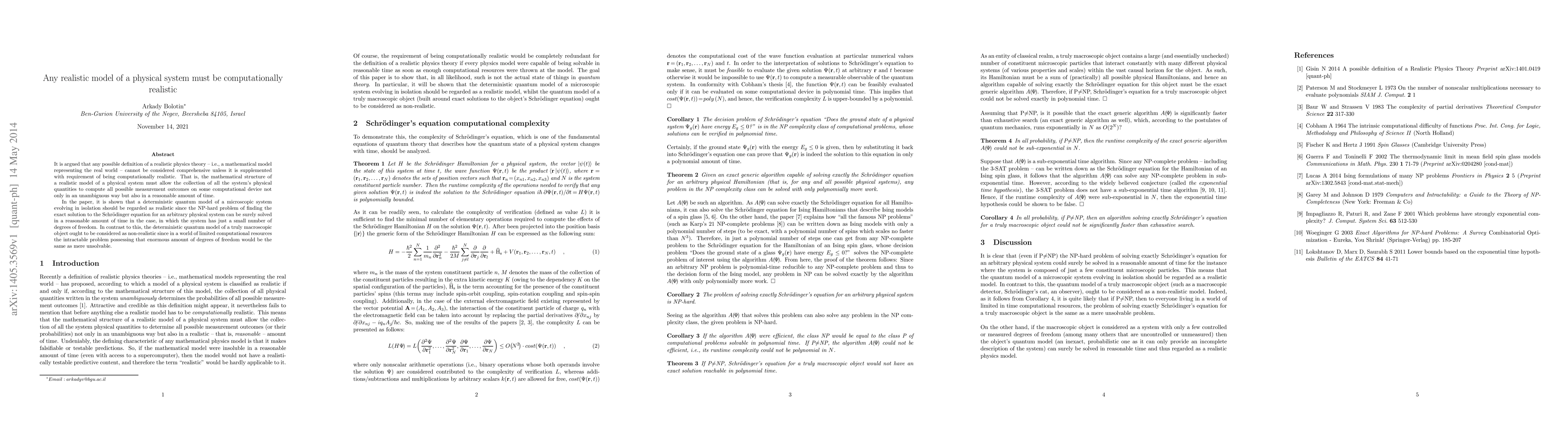 A realistic physics theory must be computationally realistic, meaning its mathematical structure can handle measurement outcomes in a reasonable amount of time. Deterministic quantum models of small systems are considered realistic, while those of large macroscopic objects are not due to their intractable computational requirements.