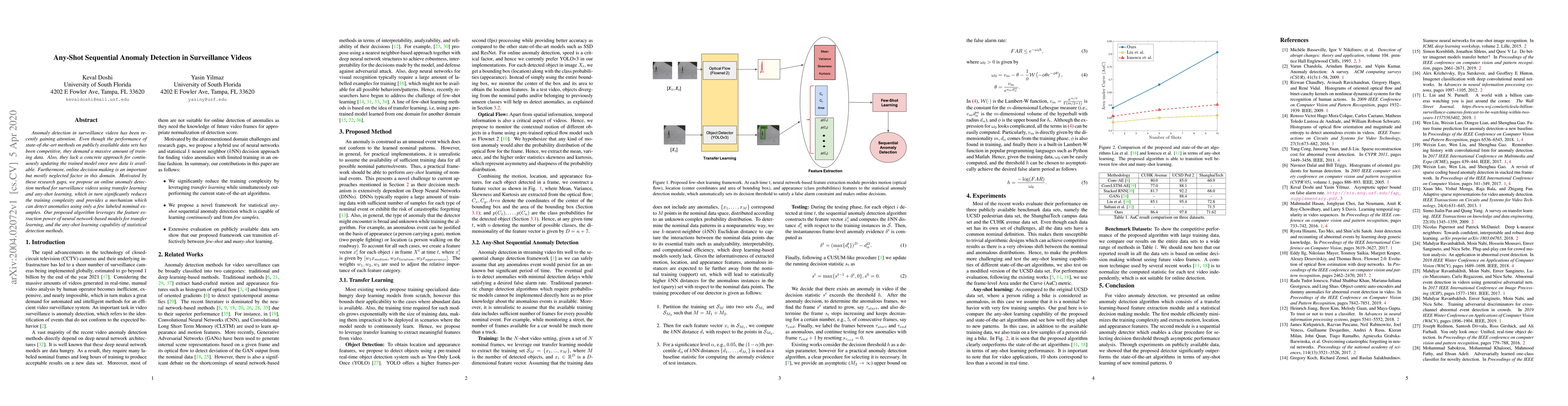 This paper proposes an online anomaly detection method for surveillance videos that utilizes transfer learning and any-shot learning to reduce training complexity and enable continuous model updates with minimal labeled data. The approach leverages neural networks for feature extraction and statistical detection methods for effective anomaly identification.