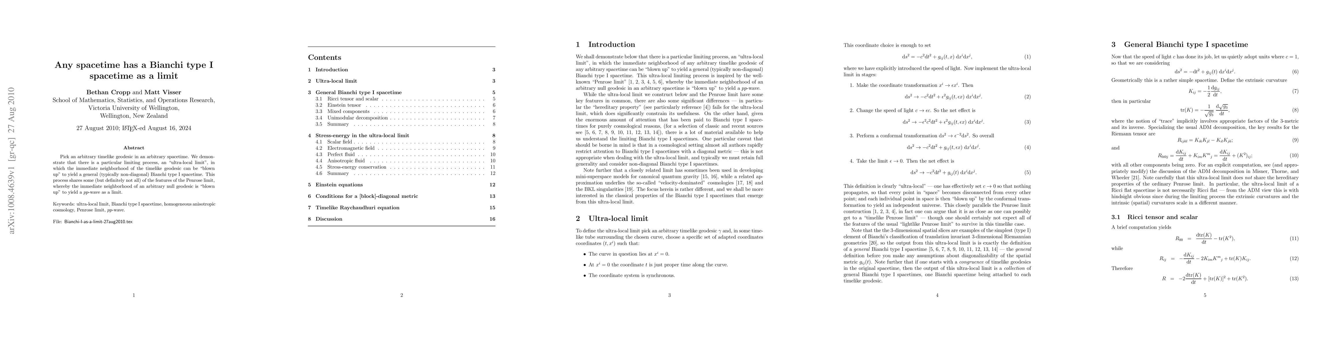 Pick an arbitrary timelike geodesic in an arbitrary spacetime. We demonstrate that there is a particular limiting process, an "ultra-local limit", in which the immediate neighborhood of the timelike geodesic can be "blown up" to yield a general (typically non-diagonal) Bianchi type I spacetime. This process shares some (but definitely not all) of the features of the Penrose limit, whereby the immediate neighborhood of an arbitrary null geodesic is "blown up" to yield a pp-wave as a limit.