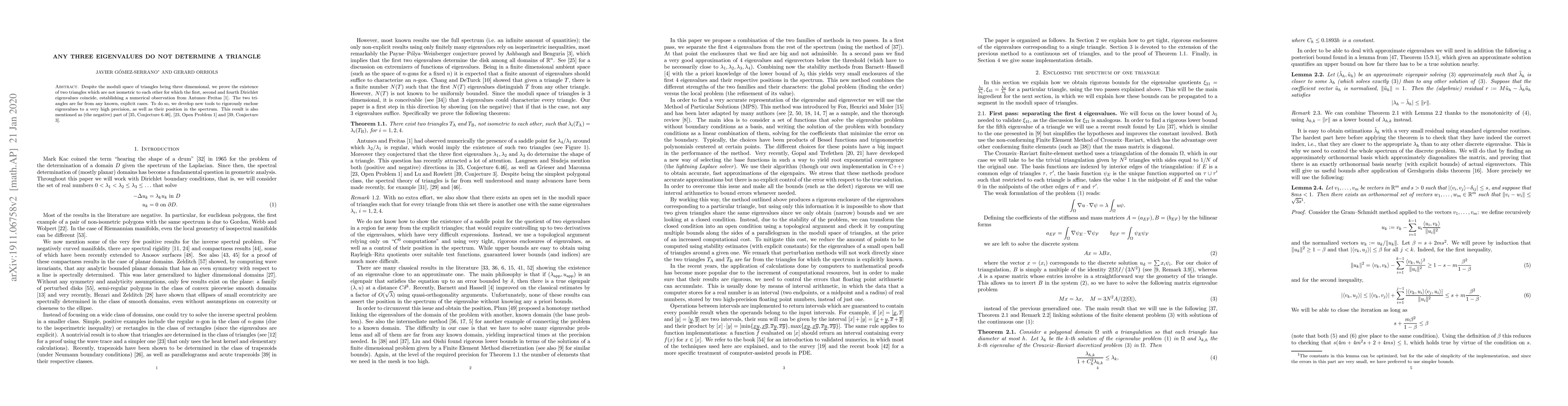 Despite the moduli space of triangles being three dimensional, we prove the existence of two triangles which are not isometric to each other for which the first, second and fourth Dirichlet eigenvalues coincide, establishing a numerical observation from Antunes-Freitas [P. R. S. Antunes and P. Freitas. Proc. R. Soc. Lond.Ser. A Math. Phys. Eng. Sci., 467(2130):1546-1562, 2011]. The two triangles are far from any known, explicit cases. To do so, we develop new tools to rigorously enclose eigenvalues to a very high precision, as well as their position in the spectrum. This result is also mentioned as (the negative part of) Conjecture 6.46 in [R. Laugesen, B. Siudeja, Shape optimization and spectral theory, 149-200. De Gruyter Open, Warsaw, 2017], Open Problem 1 in [D. Grieser, S. Maronna, Notices Amer. Math. Soc., 60(11):1440-1447, 2013] and Conjecture 3 in [Z. Lu, J. Rowlett. Amer. Math. Monthly, 122(9):815-835, 2015.].