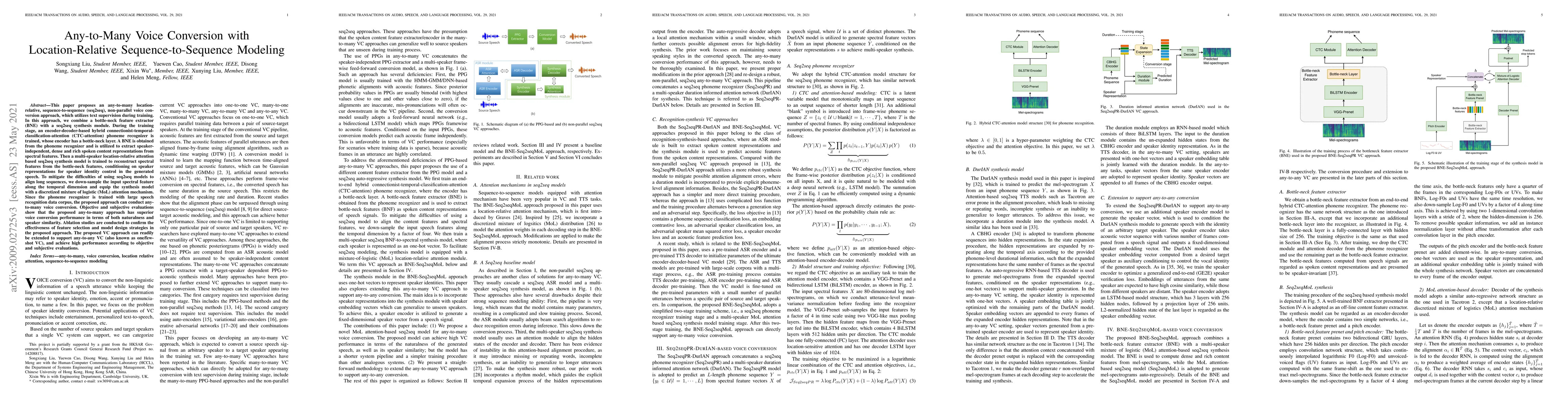 This paper proposes an any-to-many voice conversion method using a location-relative sequence-to-sequence model with text supervision, combining a bottleneck feature extractor and a multi-speaker attention-based synthesis module. Evaluations show superior performance in naturalness and speaker similarity.