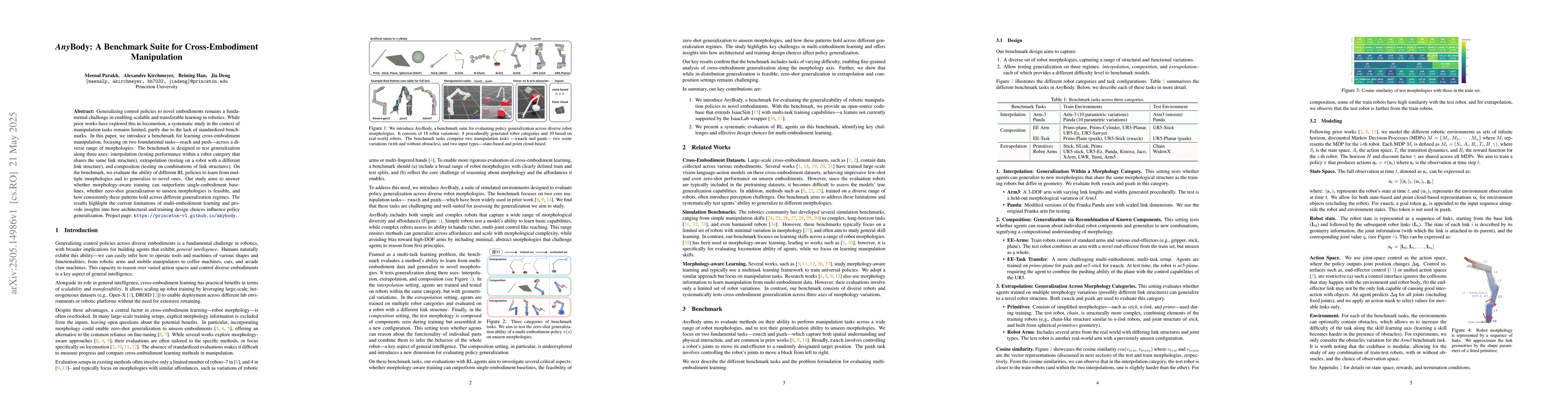 The paper introduces a benchmark suite called AnyBody for learning cross-embodiment manipulation, focusing on reach and push tasks across diverse morphologies. It evaluates generalization along three axes: interpolation, extrapolation, and composition.