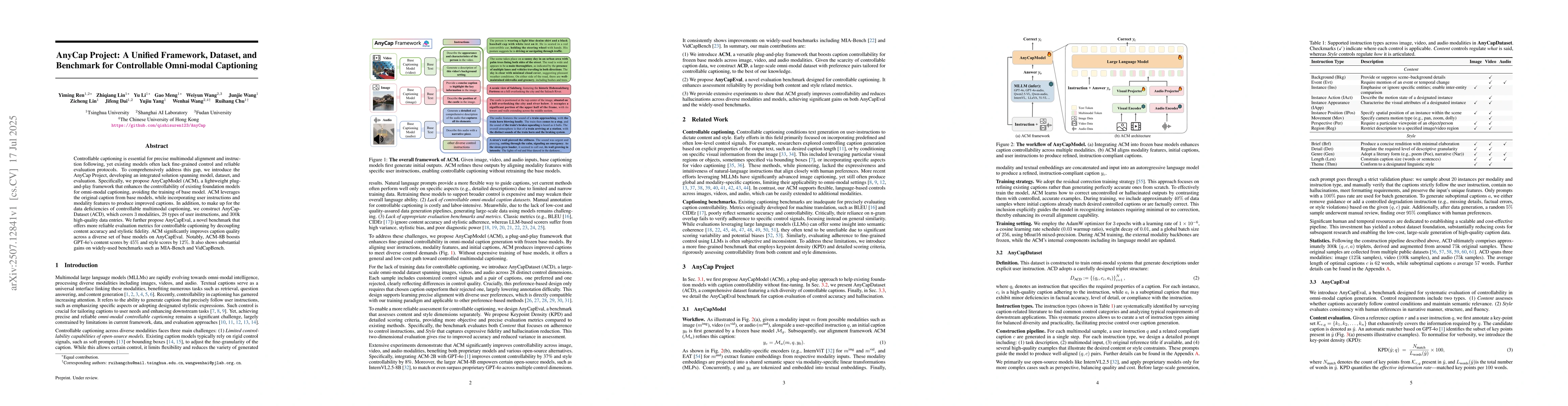 Controllable captioning is essential for precise multimodal alignment and instruction following, yet existing models often lack fine-grained control and reliable evaluation protocols. To address this gap, we present the AnyCap Project, an integrated solution spanning model, dataset, and evaluation. We introduce AnyCapModel (ACM), a lightweight plug-and-play framework that enhances the controllability of existing foundation models for omni-modal captioning without retraining the base model. ACM reuses the original captions from base models while incorporating user instructions and modality features to generate improved captions. To remedy the data scarcity in controllable multimodal captioning, we build AnyCapDataset (ACD), covering three modalities, 28 user-instruction types, and 300\,k high-quality data entries. We further propose AnyCapEval, a new benchmark that provides more reliable evaluation metrics for controllable captioning by decoupling content accuracy and stylistic fidelity. ACM markedly improves caption quality across a diverse set of base models on AnyCapEval. Notably, ACM-8B raises GPT-4o\'s content scores by 45\% and style scores by 12\%, and it also achieves substantial gains on widely used benchmarks such as MIA-Bench and VidCapBench.