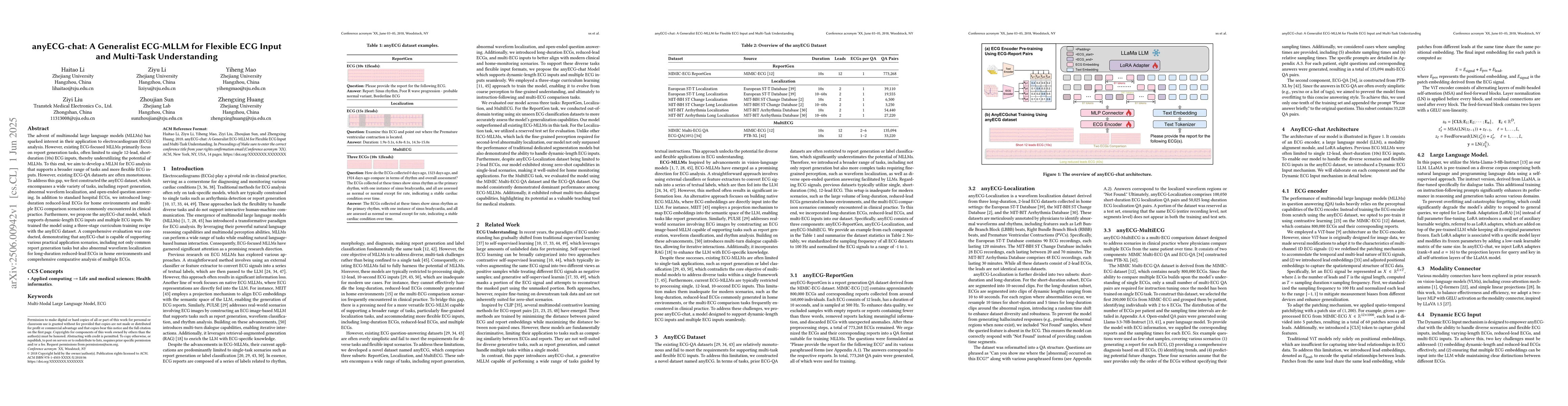 The research introduces the anyECG dataset, encompassing diverse tasks like report generation, abnormal waveform localization, and open-ended question answering, including standard hospital ECGs and long-duration reduced-lead ECGs for home environments. The anyECG-chat model is proposed, supporting dynamic-length and multiple ECG inputs, trained via a three-stage curriculum training recipe.
