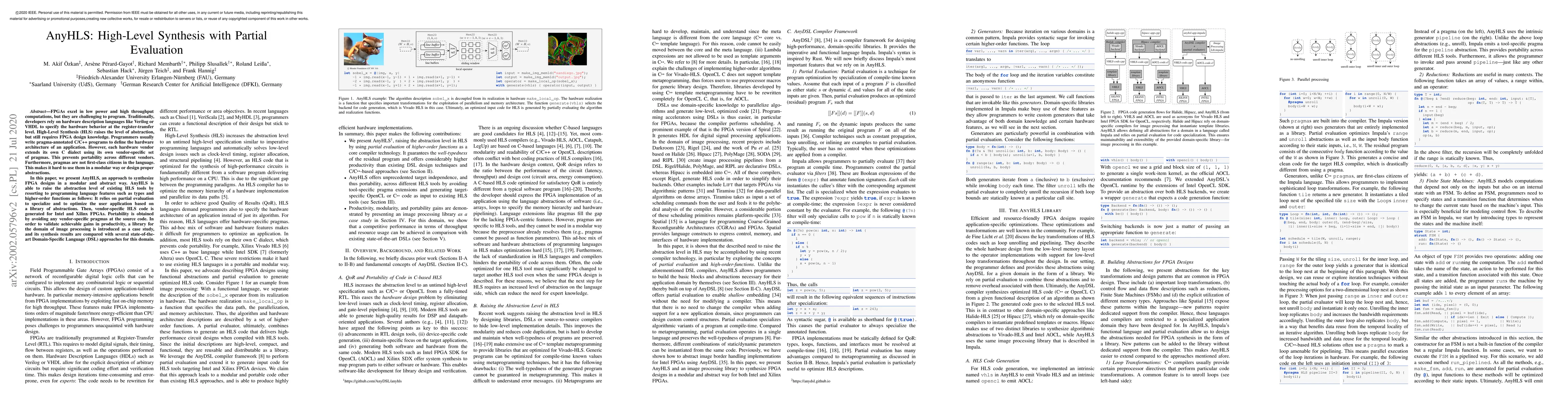 AnyHLS aims to enhance FPGA design productivity through high-level synthesis using partial evaluation, enabling modular and vendor-agnostic C/C++ programming without vendor-specific pragmas. It synthesizes FPGA designs for Intel and Xilinx platforms, validated through an image processing domain case study.
