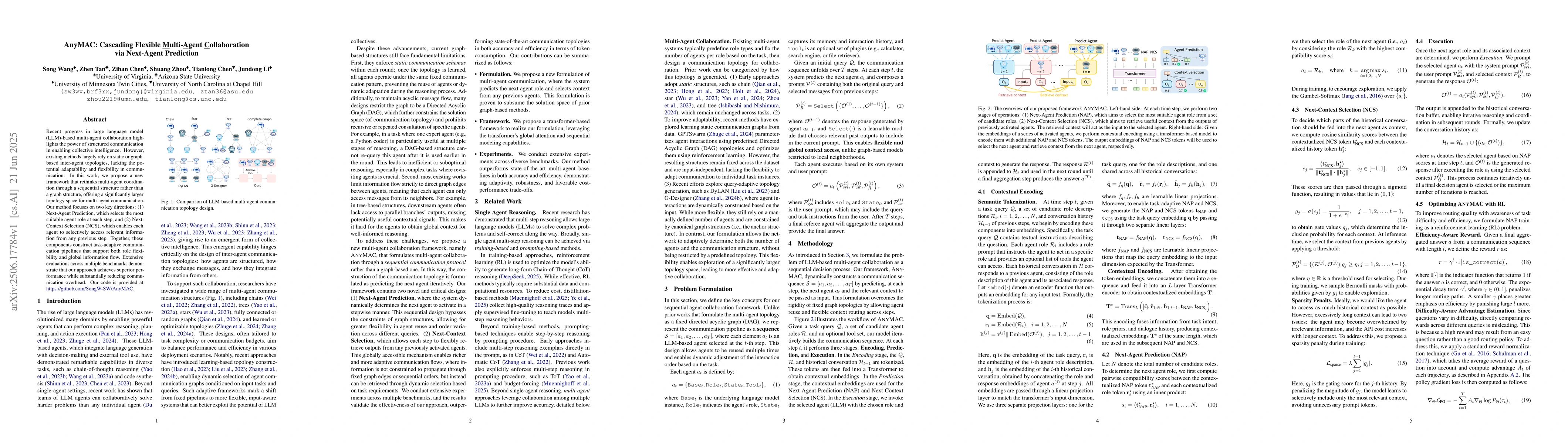 Recent progress in large language model (LLM)-based multi-agent collaboration highlights the power of structured communication in enabling collective intelligence. However, existing methods largely rely on static or graph-based inter-agent topologies, lacking the potential adaptability and flexibility in communication. In this work, we propose a new framework that rethinks multi-agent coordination through a sequential structure rather than a graph structure, offering a significantly larger topology space for multi-agent communication. Our method focuses on two key directions: (1) Next-Agent Prediction, which selects the most suitable agent role at each step, and (2) Next-Context Selection (NCS), which enables each agent to selectively access relevant information from any previous step. Together, these components construct task-adaptive communication pipelines that support both role flexibility and global information flow. Extensive evaluations across multiple benchmarks demonstrate that our approach achieves superior performance while substantially reducing communication overhead.