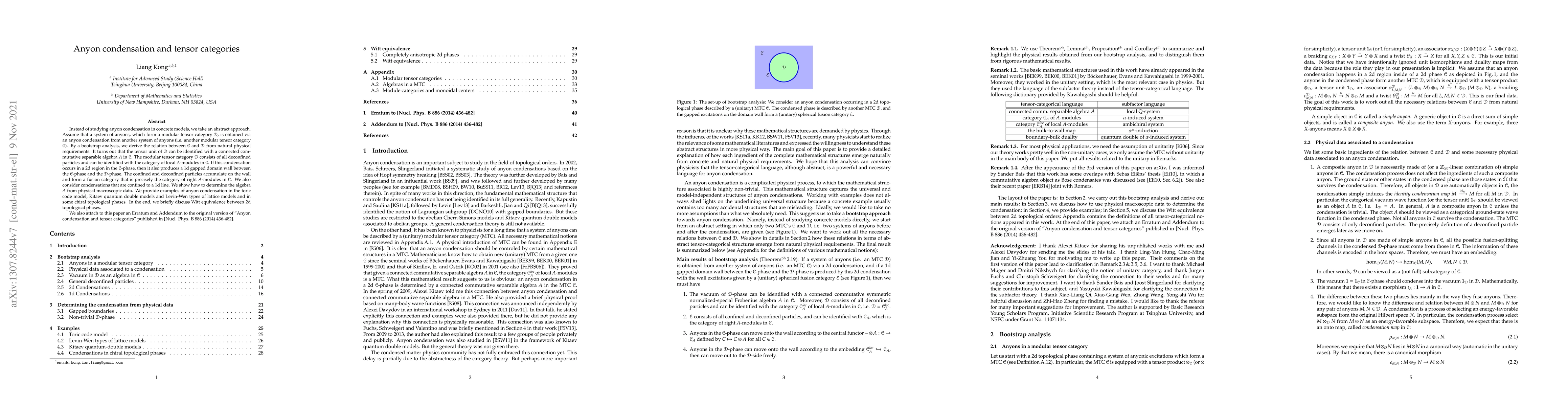 Instead of studying anyon condensation in concrete models, we take an abstract approach. Assume that a system of anyons, which form a modular tensor category D, is obtained via an anyon condensation from another system of anyons (i.e. another modular tensor category C). By a bootstrap analysis, we derive the relation between C and D from natural physical requirements. It turns out that the tensor unit of D can be identified with a connected commutative separable algebra A in C. The modular tensor category D consists of all deconfined particles and can be identified with the category of local $A$-modules in C. If this condensation occurs in a 2d region in the C-phase, then it also produces a 1d gapped domain wall between the C-phase and the D-phase. The confined and deconfined particles accumulate on the wall and form a fusion category that is precisely the category of right A-modules in C. We also consider condensations that are confined to a 1d line. We show how to determine the algebra A from physical macroscopic data. We provide examples of anyon condensation in the toric code model, Kitaev quantum double models and Levin-Wen types of lattice models and in some chiral topological phases. In the end, we briefly discuss Witt equivalence between 2d topological phases. We also attach to this paper an Erratum and Addendum to the original version of "Anyon condensation and tensor categories" published in [Nucl. Phys. B 886 (2014) 436-482].