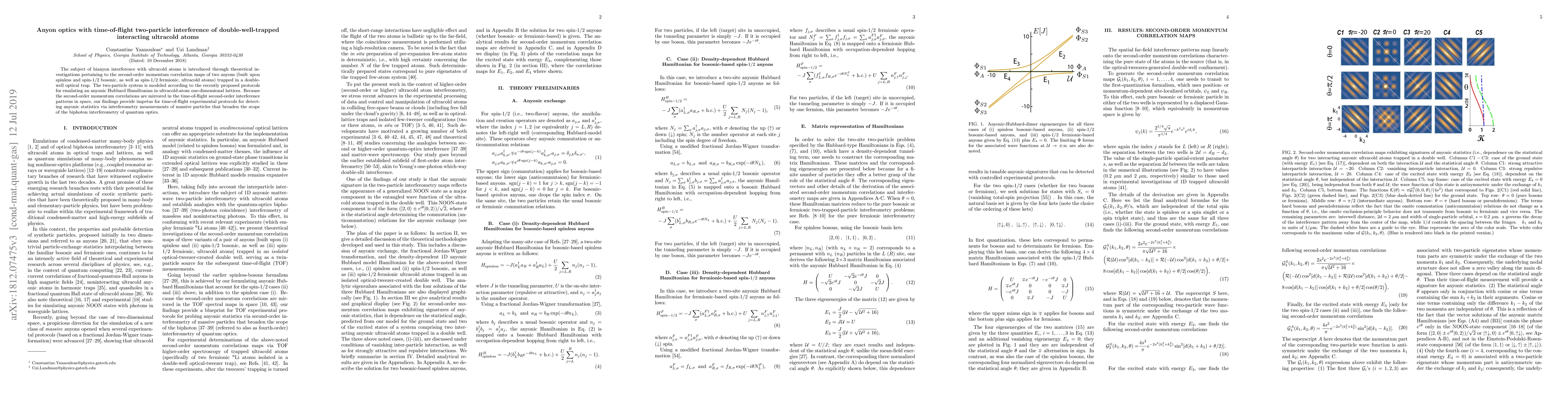 This paper investigates bianyon interference in ultracold atoms using theoretical models of second-order momentum correlations for anyons in a double-well optical trap. The findings suggest time-of-flight interferometry as a method to detect anyonic statistics, extending the application of quantum optics interferometry to massive particles.