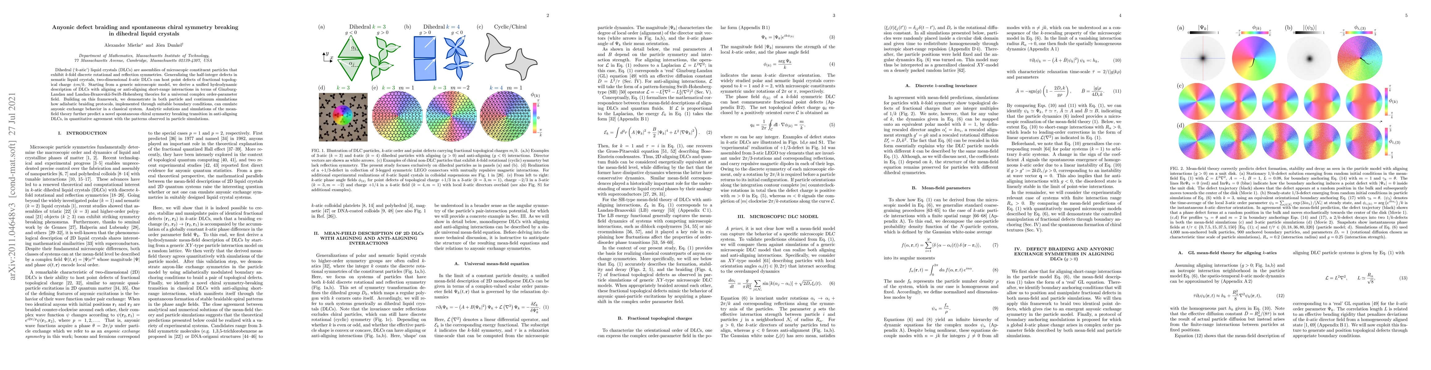 Dihedral ('$k$-atic') liquid crystals (DLCs) are assemblies of microscopic constituent particles that exhibit $k$-fold discrete rotational and reflection symmetries. Generalizing the half-integer defects in nematic liquid crystals, two-dimensional $k$-atic DLCs can host point defects of fractional topological charge $\pm m/k$. Starting from a generic microscopic model, we derive a unified hydrodynamic description of DLCs with aligning or anti-aligning short-range interactions in terms of Ginzburg-Landau and Landau-Brazovskii-Swift-Hohenberg theories for a universal complex order-parameter field. Building on this framework, we demonstrate in both particle and continuum simulations how adiabatic braiding protocols, implemented through suitable boundary conditions, can emulate anyonic exchange behavior in a classical system. Analytic solutions and simulations of the mean-field theory further predict a novel spontaneous chiral symmetry breaking transition in anti-aligning DLCs, in quantitative agreement with the patterns observed in particle simulations.