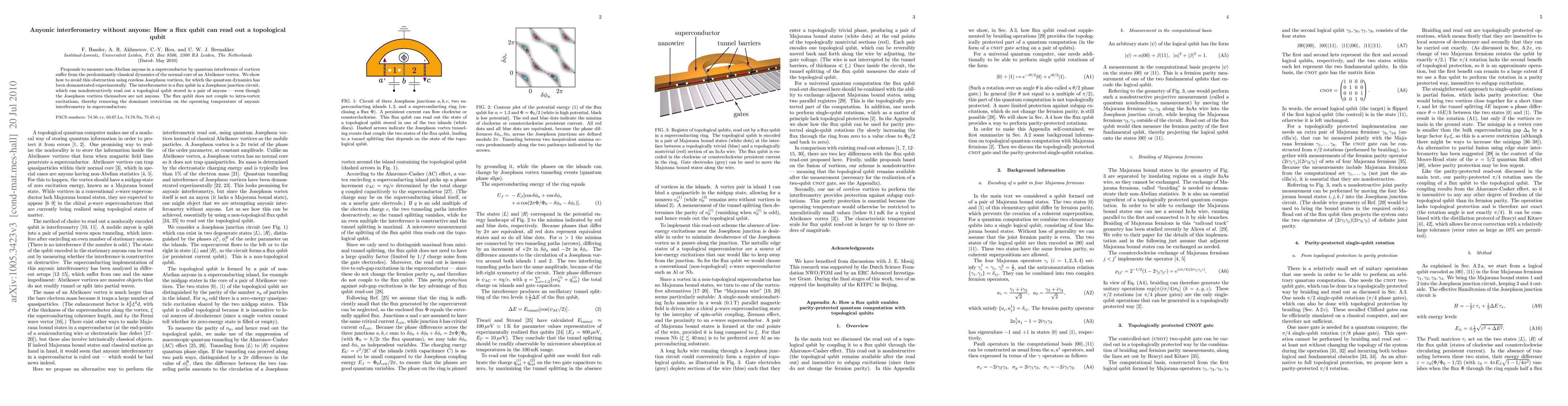 Proposals to measure non-Abelian anyons in a superconductor by quantum interference of vortices suffer from the predominantly classical dynamics of the normal core of an Abrikosov vortex. We show how to avoid this obstruction using coreless Josephson vortices, for which the quantum dynamics has been demonstrated experimentally. The interferometer is a flux qubit in a Josephson junction circuit, which can nondestructively read out a topological qubit stored in a pair of anyons --- even though the Josephson vortices themselves are not anyons. The flux qubit does not couple to intra-vortex excitations, thereby removing the dominant restriction on the operating temperature of anyonic interferometry in superconductors.