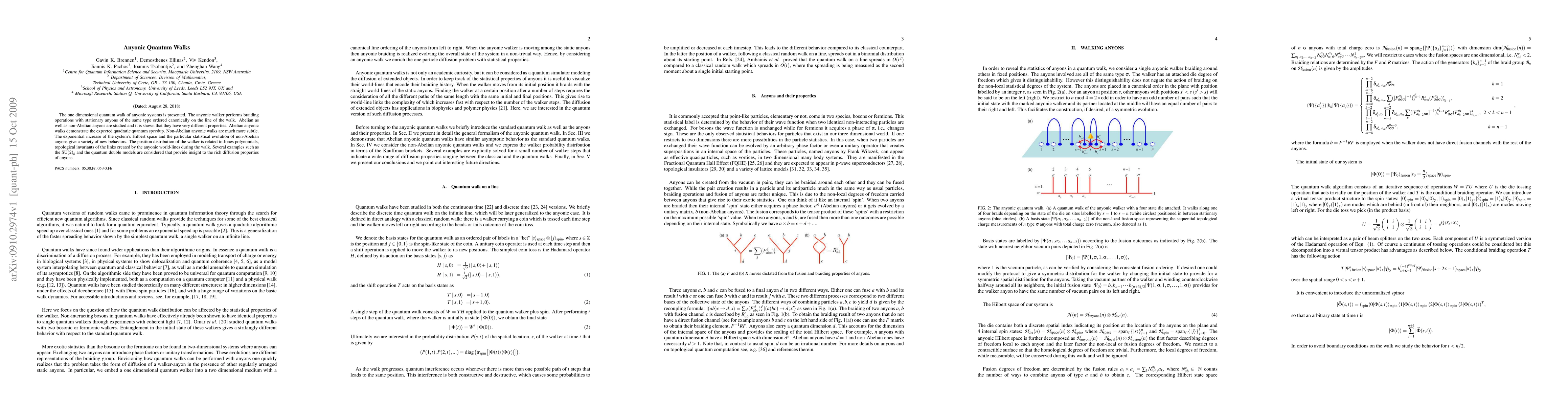 The one dimensional quantum walk of anyonic systems is presented. The anyonic walker performs braiding operations with stationary anyons of the same type ordered canonically on the line of the walk. Abelian as well as non-Abelian anyons are studied and it is shown that they have very different properties. Abelian anyonic walks demonstrate the expected quadratic quantum speedup. Non-Abelian anyonic walks are much more subtle. The exponential increase of the system's Hilbert space and the particular statistical evolution of non-Abelian anyons give a variety of new behaviors. The position distribution of the walker is related to Jones polynomials, topological invariants of the links created by the anyonic world-lines during the walk. Several examples such as the SU(2) level k and the quantum double models are considered that provide insight to the rich diffusion properties of anyons.