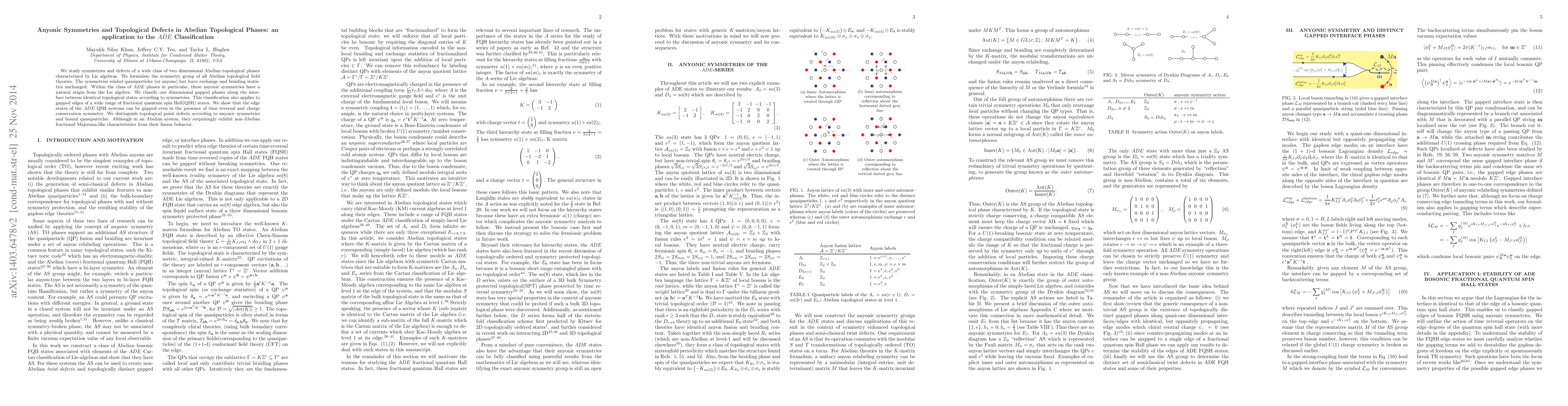 We study symmetries and defects of a wide class of two dimensional Abelian topological phases characterized by Lie algebras. We formulate the symmetry group of all Abelian topological field theories. The symmetries relabel quasiparticles (or anyons) but leave exchange and braiding statistics unchanged. Within the class of $ADE$ phases in particular, these anyonic symmetries have a natural origin from the Lie algebra. We classify one dimensional gapped phases along the interface between identical topological states according to symmetries. This classification also applies to gapped edges of a wide range of fractional quantum spin Hall(QSH) states. We show that the edge states of the $ADE$ QSH systems can be gapped even in the presence of time reversal and charge conservation symmetry. We distinguish topological point defects according to anyonic symmetries and bound quasiparticles. Although in an Abelian system, they surprisingly exhibit non-Abelian fractional Majorana-like characteristics from their fusion behavior.