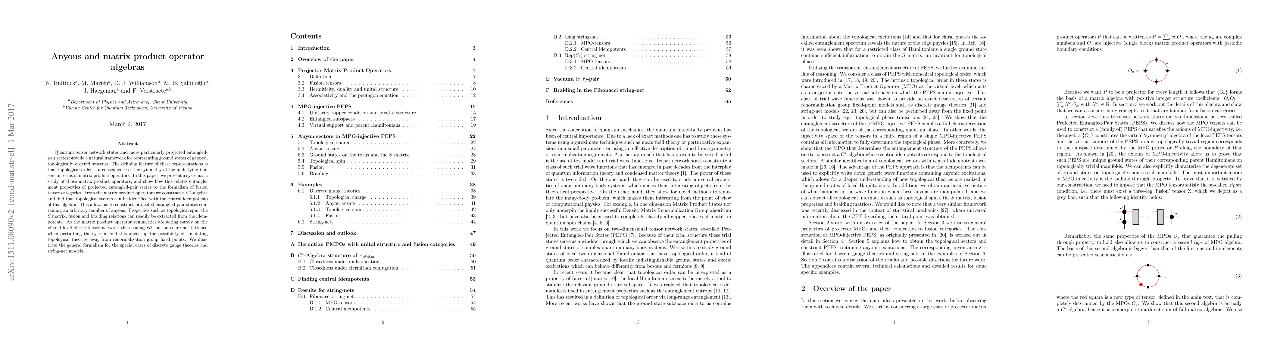 This paper explores matrix product operator algebras in the context of quantum tensor networks, specifically projected entangled-pair states, to represent topologically ordered systems. It constructs a C*-algebra from these operators to identify topological sectors and simulate anyonic properties, demonstrating the robustness of the framework for topological theories.