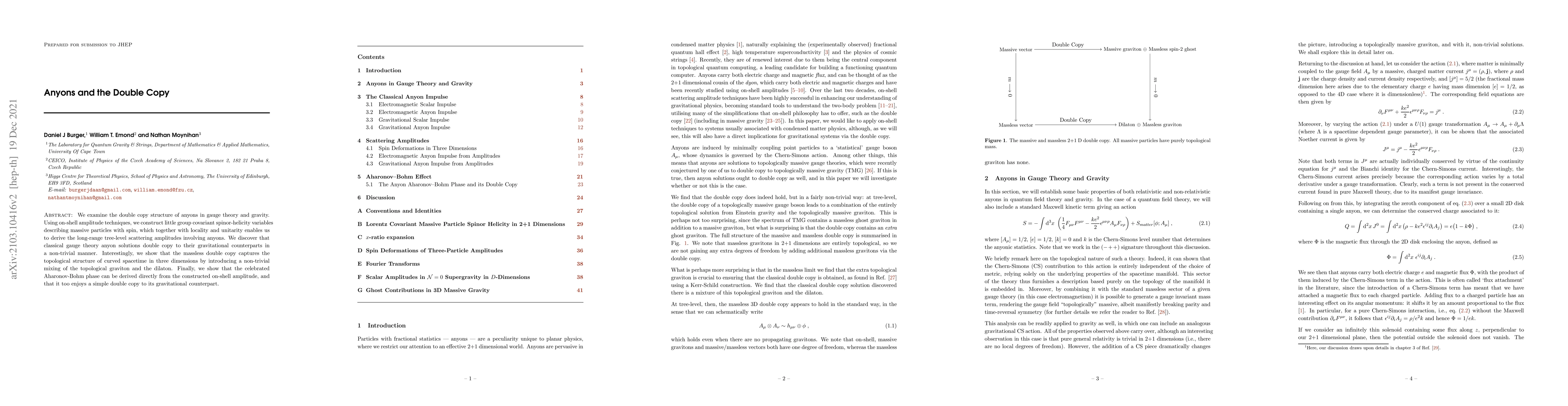 This paper explores the double copy structure relating gauge theory anyons to their gravitational counterparts using on-shell amplitude techniques, revealing a non-trivial mixing of topological fields and demonstrating that the Aharonov-Bohm phase has a simple gravitational double copy.