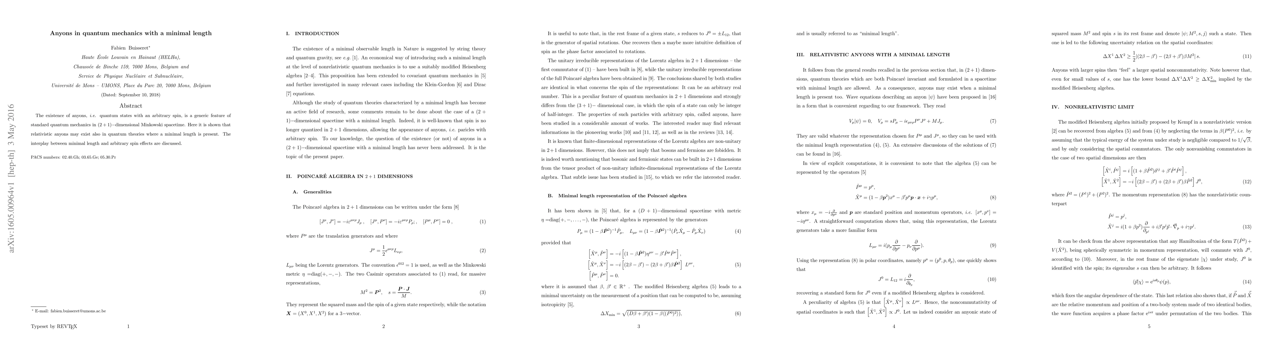 The paper presents a framework for relativistic anyons in the presence of a minimal length, utilizing a modified Heisenberg algebra and Poincaré algebra representations.