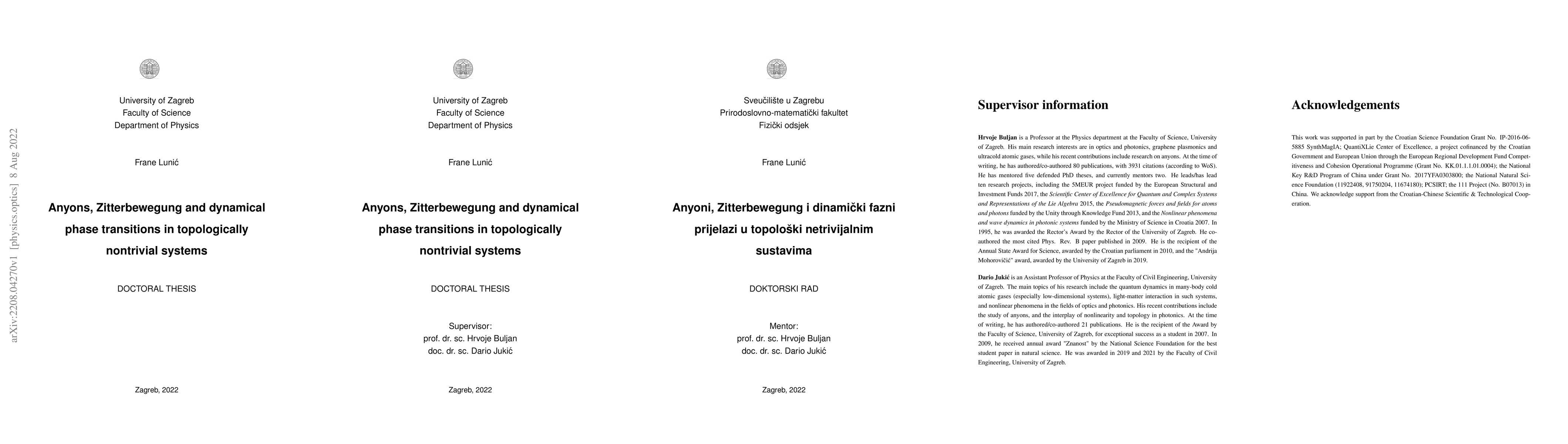 This paper explores topologically nontrivial systems, focusing on anyons, Zitterbewegung, and dynamical phase transitions. It investigates light propagation in valley modes of inversion-symmetry broken lattices, revealing a rotating spiral pattern, and demonstrates dynamical topological phase transitions in soliton SSH lattices. Additionally, it proposes a method to create synthetic anyons in a noninteracting system using fractional magnetic flux through solenoids.