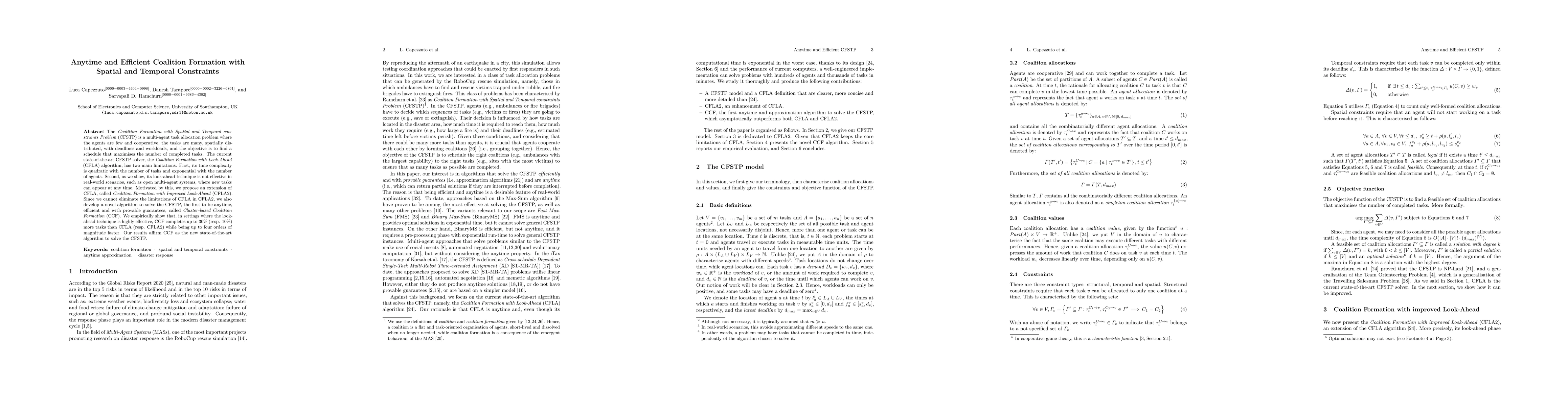 This paper introduces a novel Cluster-based Coalition Formation (CCF) algorithm to solve the Coalition Formation with Spatial and Temporal constraints Problem (CFSTP), addressing the limitations of existing algorithms, including the exponential time complexity and ineffectiveness of the look-ahead technique. CCF is anytime, efficient, and outperforms existing methods by completing up to 30% more tasks while being significantly faster.