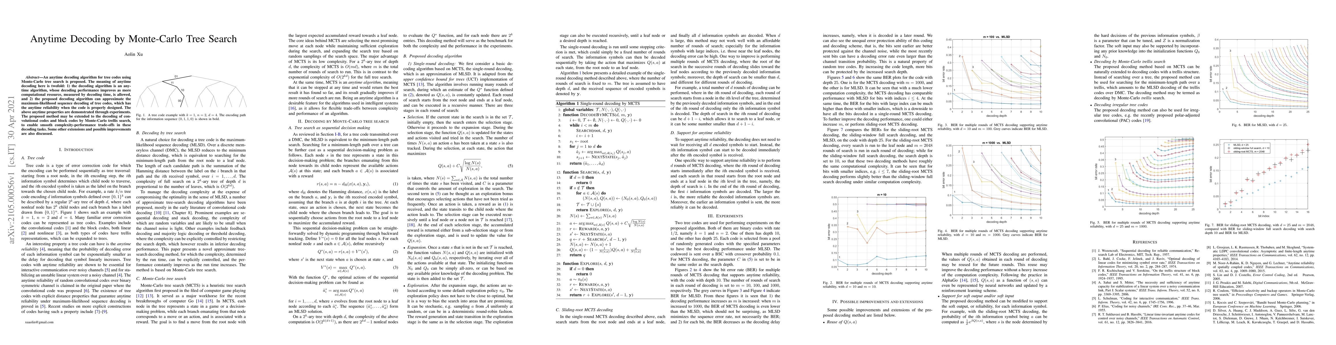 This paper introduces an anytime decoding algorithm for tree codes employing Monte-Carlo tree search, which improves performance with more time and approximates maximum-likelihood sequence decoding. Experiments demonstrate its effectiveness and potential extensions to convolutional and block codes.