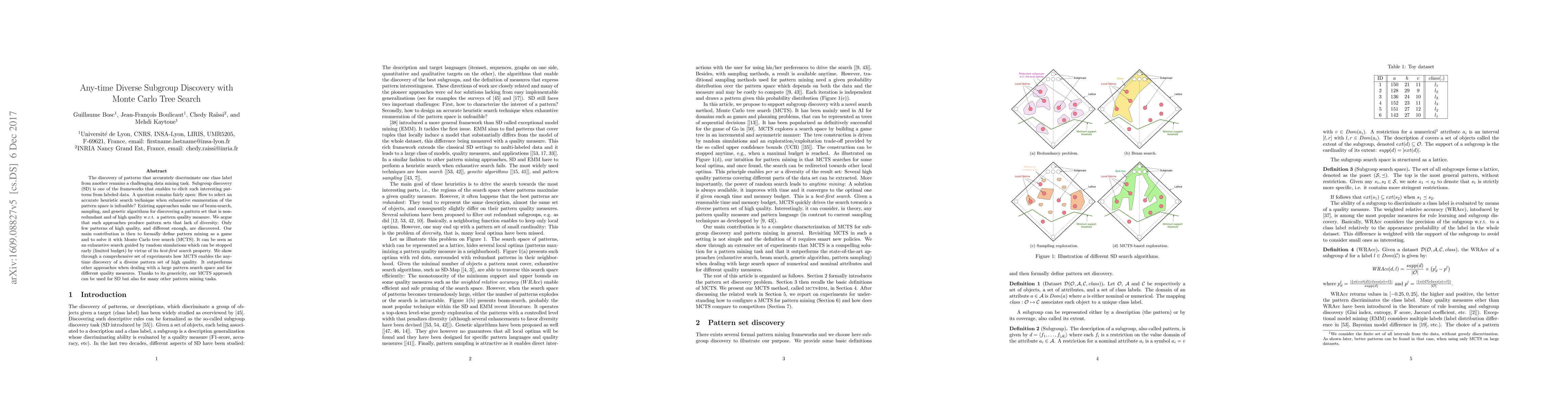 The discovery of patterns that accurately discriminate one class label from another remains a challenging data mining task. Subgroup discovery (SD) is one of the frameworks that enables to elicit such interesting hypotheses from labeled data. A question remains fairly open: How to select an accurate heuristic search technique when exhaustive enumeration of the pattern space is infeasible? Existing approaches make use of beam-search, sampling and genetic algorithms for discovering a pattern set that is non-redundant and of high quality w.r.t. a pattern quality measure. We argue that such approaches produce pattern sets that lack of diversity: Only few patterns of high quality, and different enough, are discovered. Our main contribution is then to formally define pattern mining as a game and to solve it with Monte Carlo tree search (MCTS). It can be seen as an exhaustive search guided by random simulations which can be stopped early (limited budget) by virtue of its best-first search property. We show through a comprehensive set of experiments how MCTS enables the anytime discovery of a diverse pattern set of high quality. It outperforms other approaches when dealing with a large pattern search space and for different quality measures. Thanks to its genericity, our MCTS settings can be used for SD but also for many other pattern mining tasks.