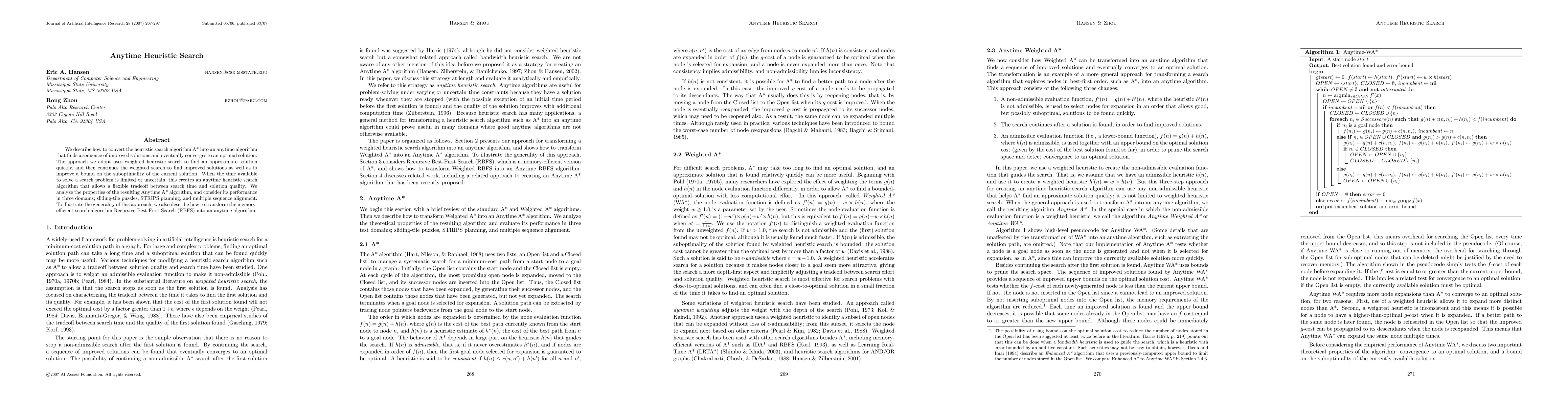 We describe how to convert the heuristic search algorithm A* into an anytime algorithm that finds a sequence of improved solutions and eventually converges to an optimal solution. The approach we adopt uses weighted heuristic search to find an approximate solution quickly, and then continues the weighted search to find improved solutions as well as to improve a bound on the suboptimality of the current solution. When the time available to solve a search problem is limited or uncertain, this creates an anytime heuristic search algorithm that allows a flexible tradeoff between search time and solution quality. We analyze the properties of the resulting Anytime A* algorithm, and consider its performance in three domains; sliding-tile puzzles, STRIPS planning, and multiple sequence alignment. To illustrate the generality of this approach, we also describe how to transform the memory-efficient search algorithm Recursive Best-First Search (RBFS) into an anytime algorithm.