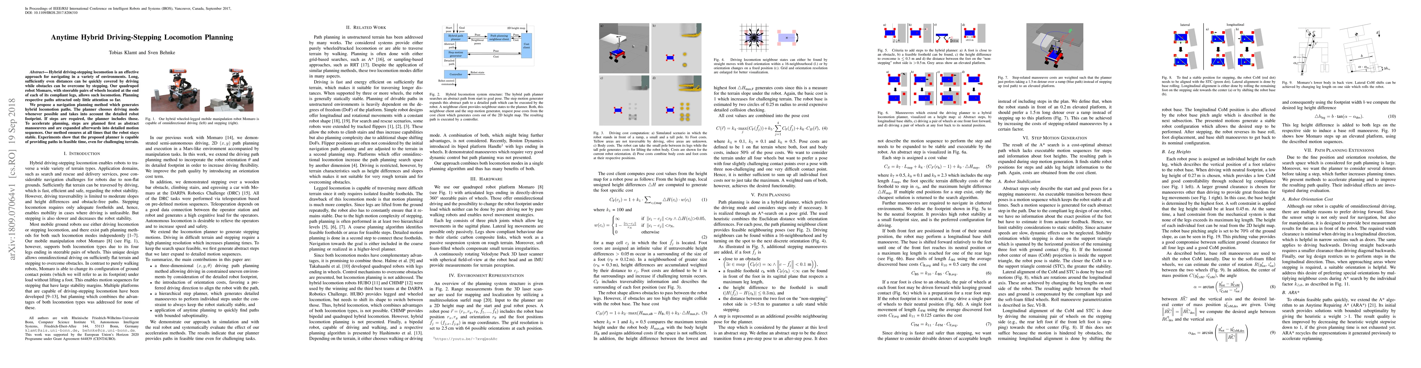 The paper presents a navigation planning method for a quadruped robot, Momaro, that combines driving and stepping locomotion. The method prioritizes driving for efficient long distances, and planning steps as abstract maneuvers for stability and obstacle clearance, ensuring feasible path generation in varied terrains within reasonable time.