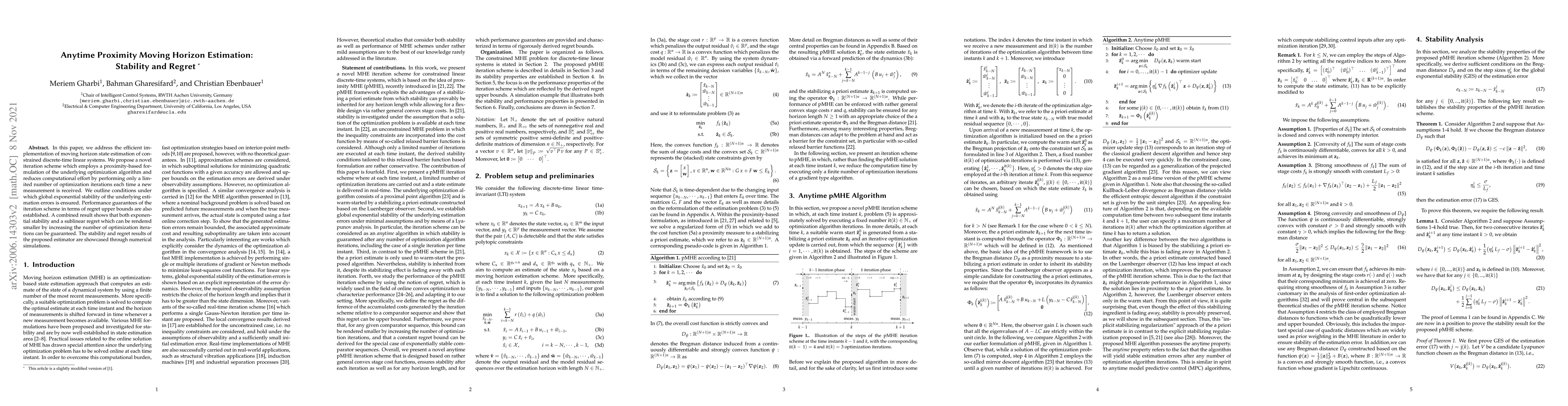This paper proposes an efficient moving horizon state estimation method for constrained discrete-time linear systems, utilizing a limited number of optimization iterations to reduce computational effort. It ensures global exponential stability and provides sublinear regret bounds, demonstrating both stability and performance through numerical simulations.