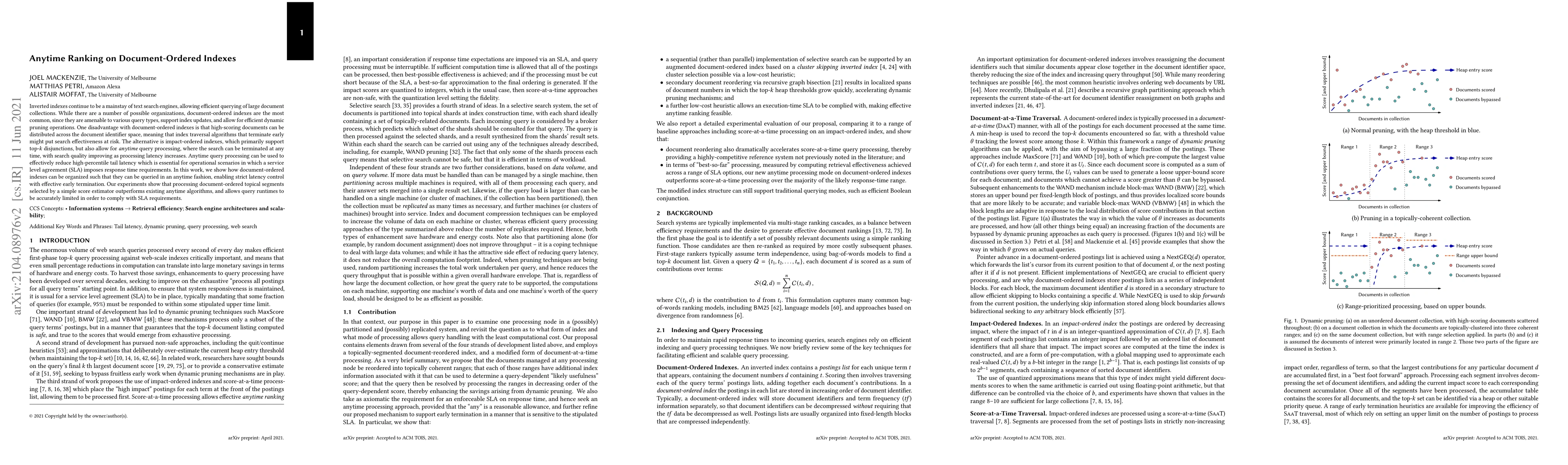 This paper proposes a method to organize document-ordered indexes for anytime ranking, enabling efficient query processing with strict latency control and early termination. Experimental results demonstrate that this approach outperforms existing anytime algorithms and effectively limits query runtimes to meet SLA requirements.