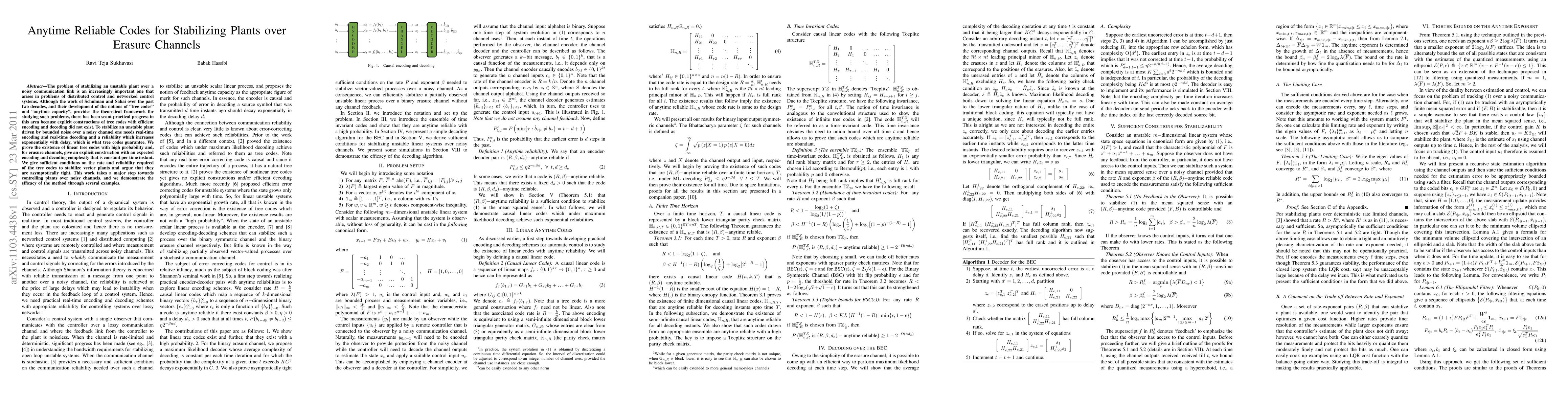 The problem of stabilizing an unstable plant over a noisy communication link is an increasingly important one that arises in problems of distributed control and networked control systems. Although the work of Schulman and Sahai over the past two decades, and their development of the notions of "tree codes" and "anytime capacity", provides the theoretical framework for studying such problems, there has been scant practical progress in this area because explicit constructions of tree codes with efficient encoding and decoding did not exist. To stabilize an unstable plant driven by bounded noise over a noisy channel one needs real-time encoding and real-time decoding and a reliability which increases exponentially with delay, which is what tree codes guarantee. We prove the existence of linear tree codes with high probability and, for erasure channels, give an explicit construction with an expected encoding and decoding complexity that is constant per time instant. We give sufficient conditions on the rate and reliability required of the tree codes to stabilize vector plants and argue that they are asymptotically tight. This work takes a major step towards controlling plants over noisy channels, and we demonstrate the efficacy of the method through several examples.