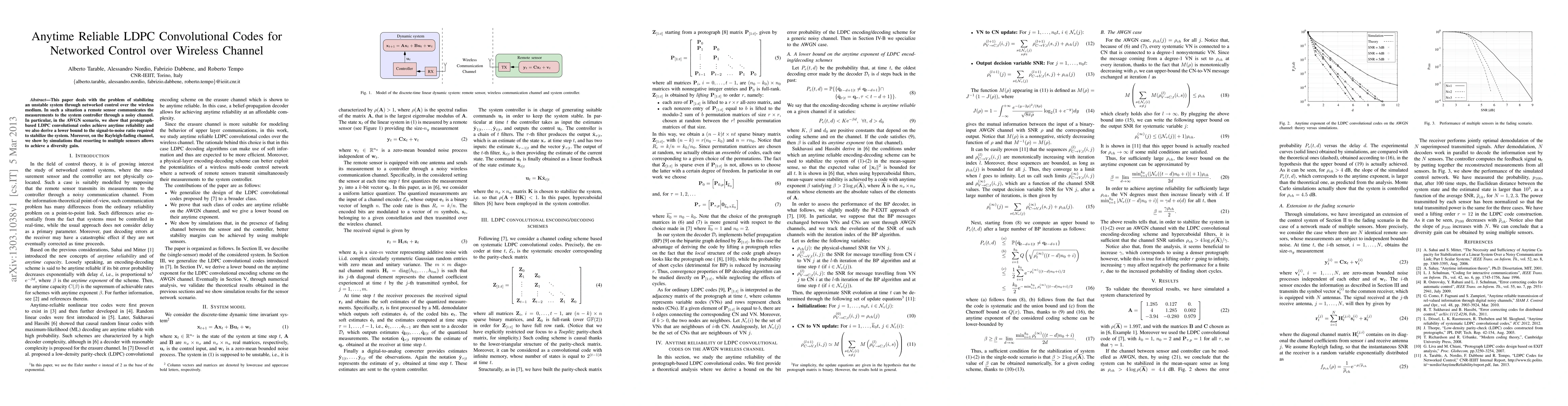 This paper deals with the problem of stabilizing an unstable system through networked control over the wireless medium. In such a situation a remote sensor communicates the measurements to the system controller through a noisy channel. In particular, in the AWGN scenario, we show that protograph-based LDPC convolutional codes achieve anytime reliability and we also derive a lower bound to the signal-to-noise ratio required to stabilize the system. Moreover, on the Rayleigh-fading channel, we show by simulations that resorting to multiple sensors allows to achieve a diversity gain.