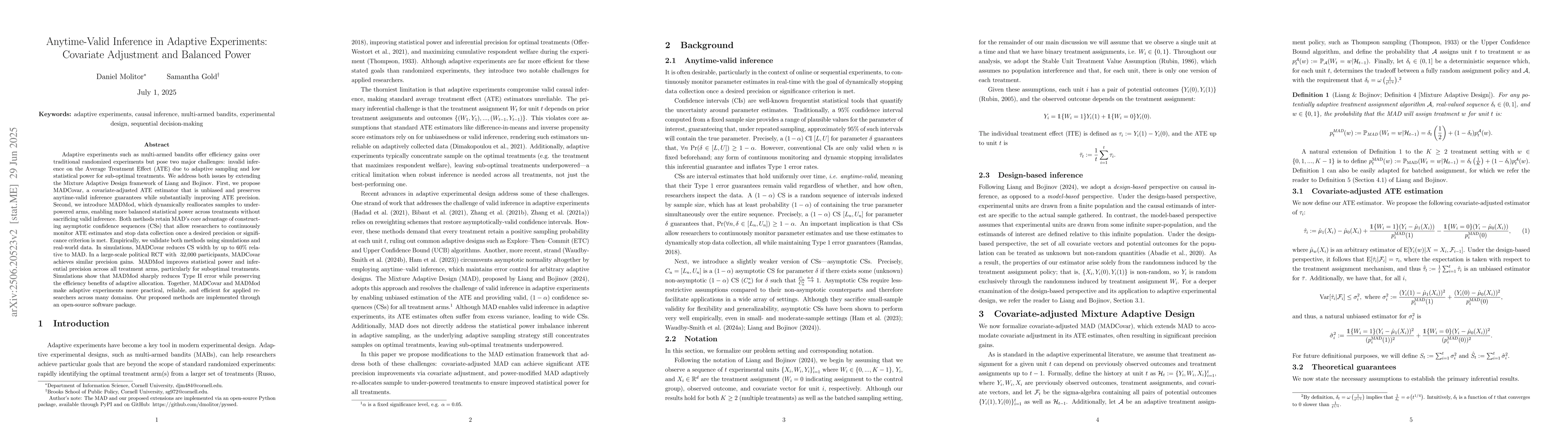 Adaptive experiments have become central to modern experimental design, enabling researchers to efficiently identify optimal treatments, improve statistical power, and maximize respondent welfare. However, adaptive experiments compromise valid inference and leave sub-optimal treatments underpowered. We introduce two methodological advances for adaptive experimentation. First, covariate-adjusted Mixture Adaptive Design (MADCovar) achieves substantial improvements in average treatment effect (ATE) precision by incorporating covariate adjustment within an anytime-valid inference framework. Second, power-modified MAD (MADMod) reallocates sample to underpowered treatment arms, improving statistical power across all treatments while maintaining error control. Both methods provide anytime-valid guarantees, enabling continuous monitoring without inflating Type 1 error rates. Simulation studies and empirical analyses demonstrate that MADCovar delivers significant precision gains and that MADMod ensures robust inference even for suboptimal treatments. Together, these methods address key limitations of adaptive experiments and equip researchers with practical tools for precise and reliable causal inference. Our proposed methods are implemented through an open-source software package.