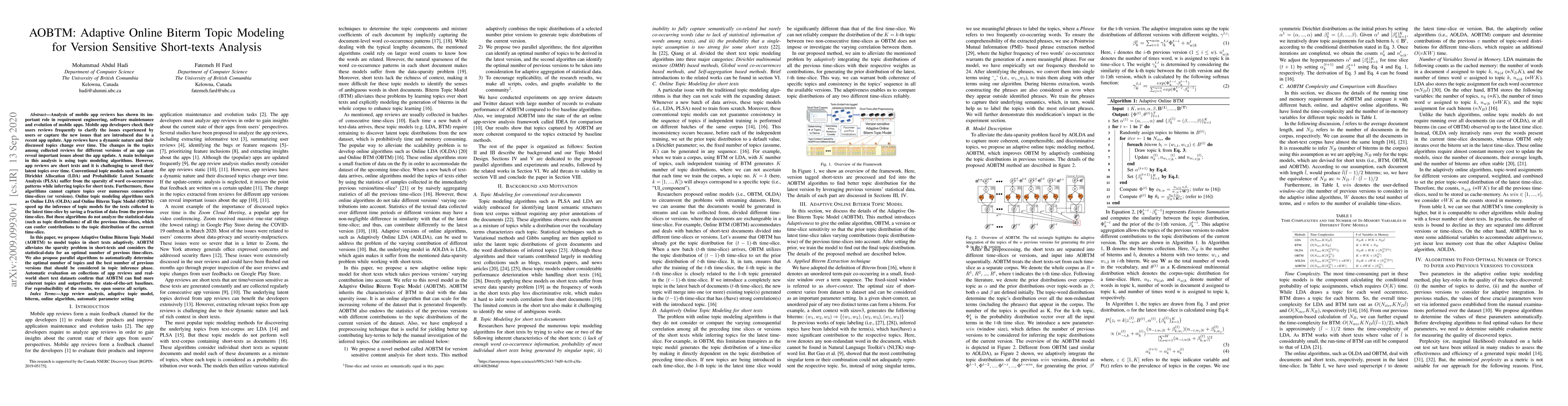 The paper introduces Adaptive Online Biterm Topic Modeling (AOBTM) to address the sparsity issue in analyzing short texts, like mobile app reviews, over time. AOBTM dynamically models topics and considers statistical data from relevant previous time-slices, outperforming existing models in coherence and accuracy.