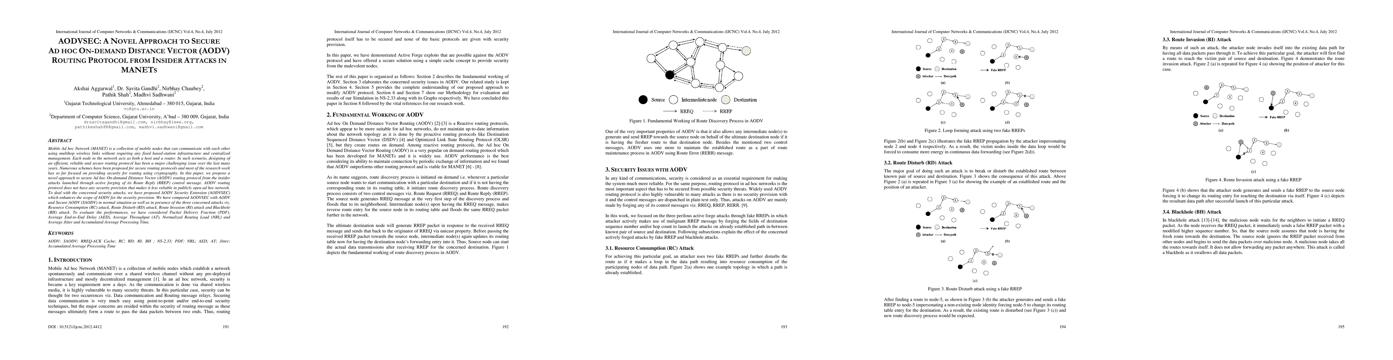 This paper proposes AODVSEC, a novel security extension for the AODV routing protocol to protect against insider attacks in MANETs, particularly focusing on active forging of Route Reply messages. The performance of AODVSEC is compared against AODV and SAODV under various attack scenarios, evaluating metrics like Packet Delivery Fraction, Average End-to-End Delay, and Average Throughput.