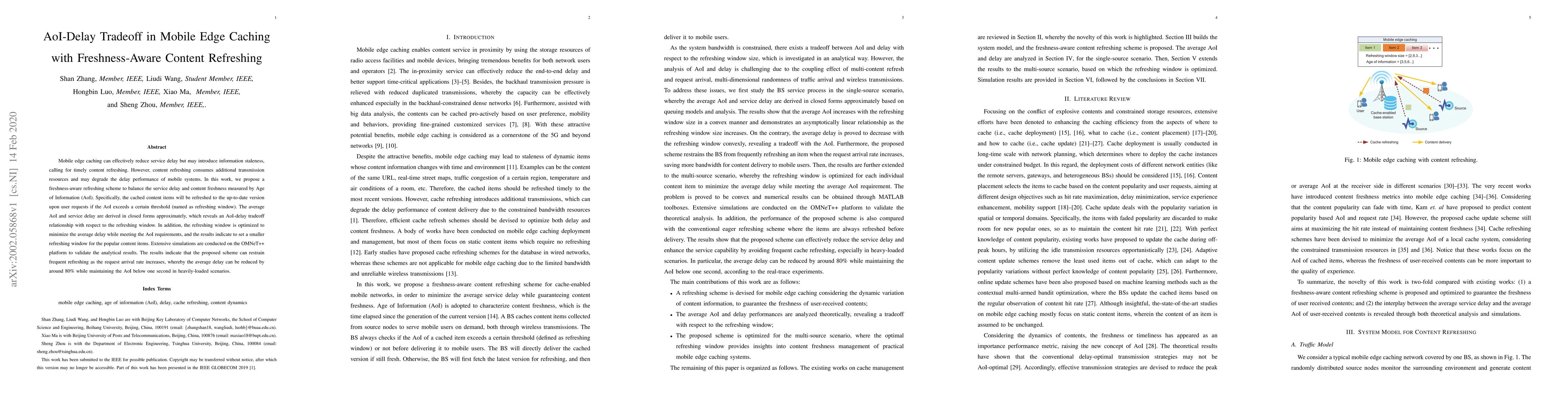 This paper proposes a freshness-aware refreshing scheme to balance service delay and content freshness in mobile edge caching, optimizing the refreshing window to minimize delay while maintaining low Age of Information (AoI). Simulations show the scheme can reduce average delay by 80% while keeping AoI under one second under high load.