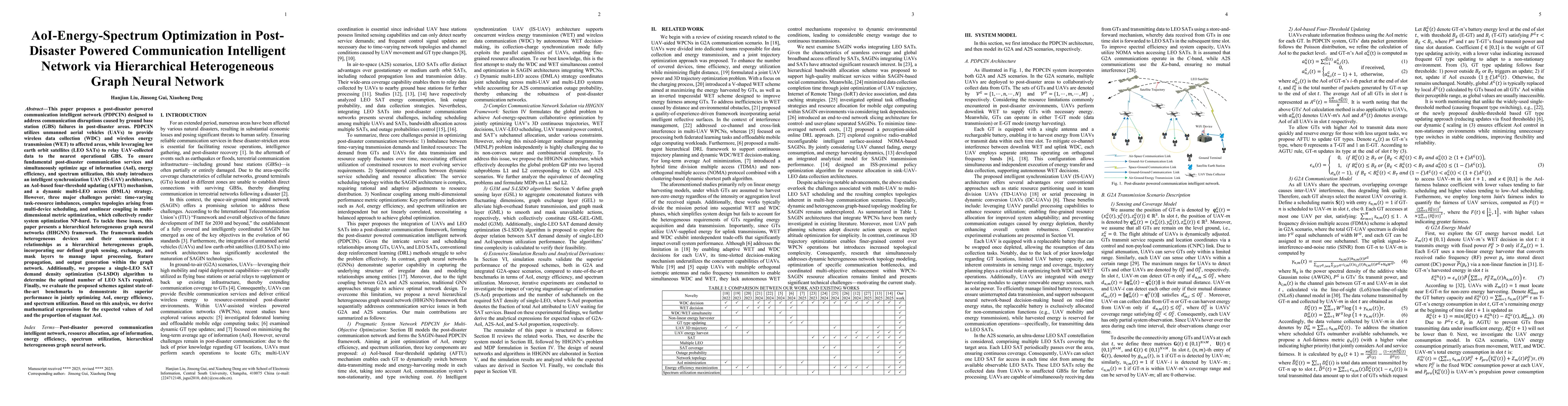 This paper designs a post-disaster powered communication intelligent network (PDPCIN) to address communication disruptions caused by ground base station (GBS) failures within the post-disaster area. PDPCIN employs unmanned aerial vehicles (UAVs) to provide wireless data collection (WDC) and wireless energy transmission (WET) for affected areas and leverages low earth orbit satellites (LEO SATs) to relay UAV data to the nearest survival GBS. To ensure basic post-disaster communication while co-optimizing age of information (AoI), energy efficiency, and spectrum efficiency, intelligent synchronization-UAV (IS-UAV) architecture, AoI-based four thresholds updating (AFTU) mechanism, and Dynamic multi-LEO access (DMLA) strategy are proposed. However, three key challenges remain: time-varying task-resource imbalances, complex topology caused by multi-device scheduling, and nonlinear coupling in multidimensional metric optimization, making system optimization NP-hard. Therefore, this paper proposes a hierarchical heterogeneous graph neural networks (HHGNN) framework. It models heterogeneous device nodes and their communication relations as a hierarchical heterogeneous graph structure, integrating our defined graph sensing, exchange, and mask layer to handle the network's input, feature propagation, and output. To search appropriate number of single-LEO SATs, we propose single-LEO SAT density optimization (S-LSDO) algorithm. Finally, we compare the proposed scheme with state-of-the-art benchmarks to validate its superior collaborative optimization of AoI, energy efficiency, and spectrum efficiency. Based on this, we derive the expressions for the expected values of AoI and stagnant AoI proportion.