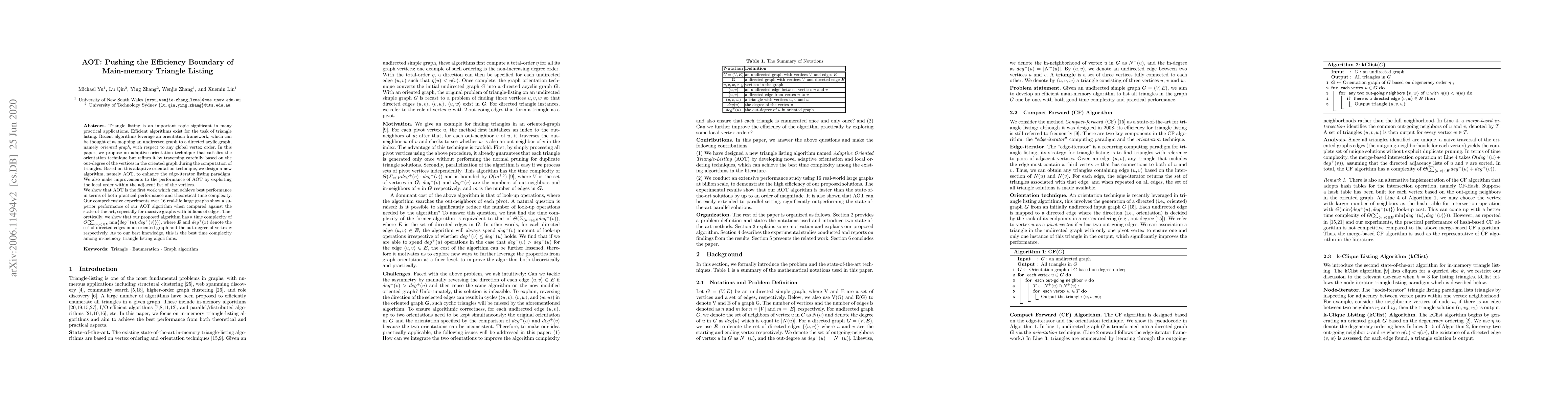 Triangle listing is an important topic significant in many practical applications. Efficient algorithms exist for the task of triangle listing. Recent algorithms leverage an orientation framework, which can be thought of as mapping an undirected graph to a directed acylic graph, namely oriented graph, with respect to any global vertex order. In this paper, we propose an adaptive orientation technique that satisfies the orientation technique but refines it by traversing carefully based on the out-degree of the vertices in the oriented graph during the computation of triangles. Based on this adaptive orientation technique, we design a new algorithm, namely aot, to enhance the edge-iterator listing paradigm. We also make improvements to the performance of aot by exploiting the local order within the adjacent list of the vertices. We show that aot is the first work which can achieve best performance in terms of both practical performance and theoretical time complexity. Our comprehensive experiments over $16$ real-life large graphs show a superior performance of our \aot algorithm when compared against the state-of-the-art, especially for massive graphs with billions of edges. Theoretically, we show that our proposed algorithm has a time complexity of $\Theta(\sum_{ \langle u,v \rangle \in \vec{E} } \min\{ deg^{+}(u),deg^{+}(v)\}))$, where $\vec{E}$ and $deg^{+}(x)$ denote the set of directed edges in an oriented graph and the out-degree of vertex $x$ respectively. As to our best knowledge, this is the best time complexity among in-memory triangle listing algorithms.