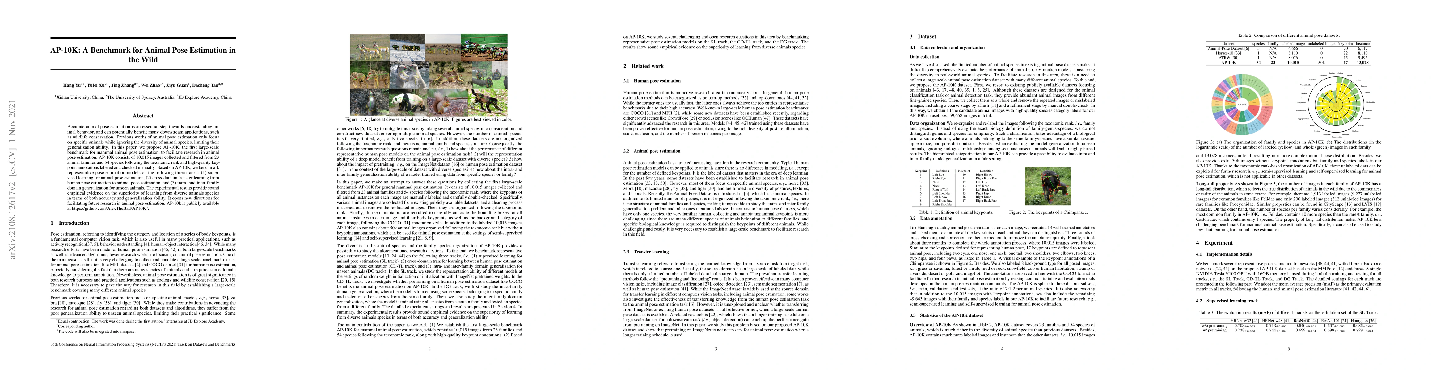This paper introduces AP-10K, a large-scale benchmark for mammal animal pose estimation, consisting of 10,015 images from 23 families and 54 species. It evaluates the performance of pose estimation models across three tracks, demonstrating the benefits of learning from diverse species for both accuracy and generalization.