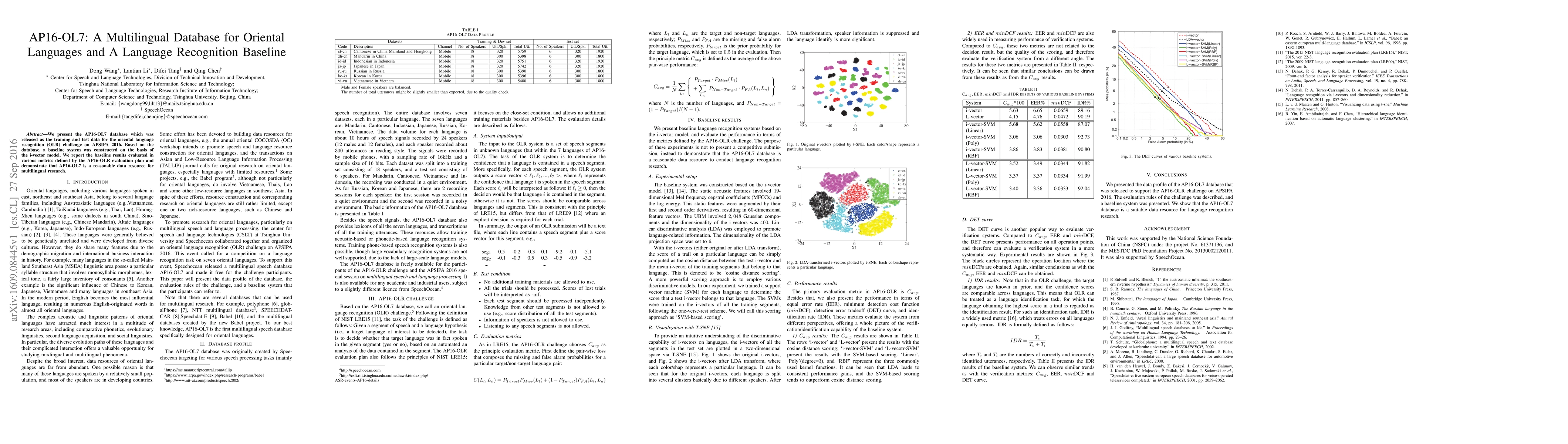 A multilingual database called AP16-OL7 was created for oriental language recognition, providing a baseline system that achieved reasonable results in various metrics. The database is a valuable resource for multilingual research.