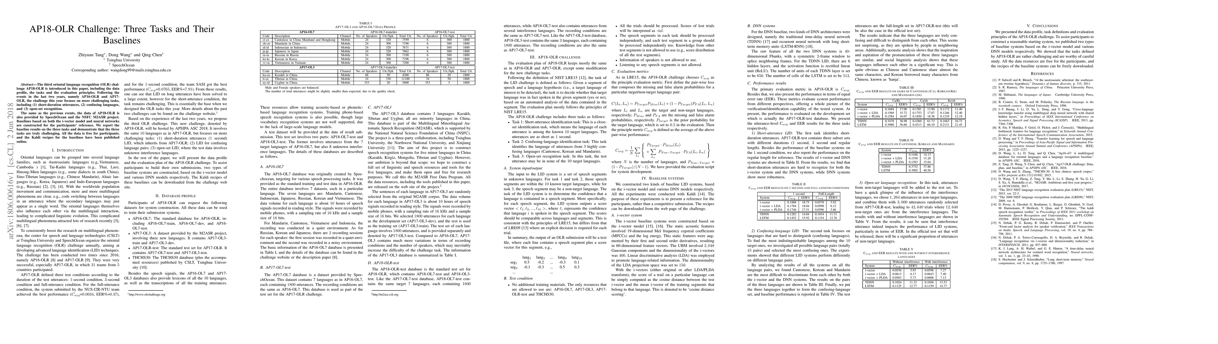 The AP18-OLR Challenge introduces three new tasks in Oriental Language Recognition: short-duration utterances, confusing languages, and open-set recognition, with baseline results using i-vector models and neural networks provided for reference.