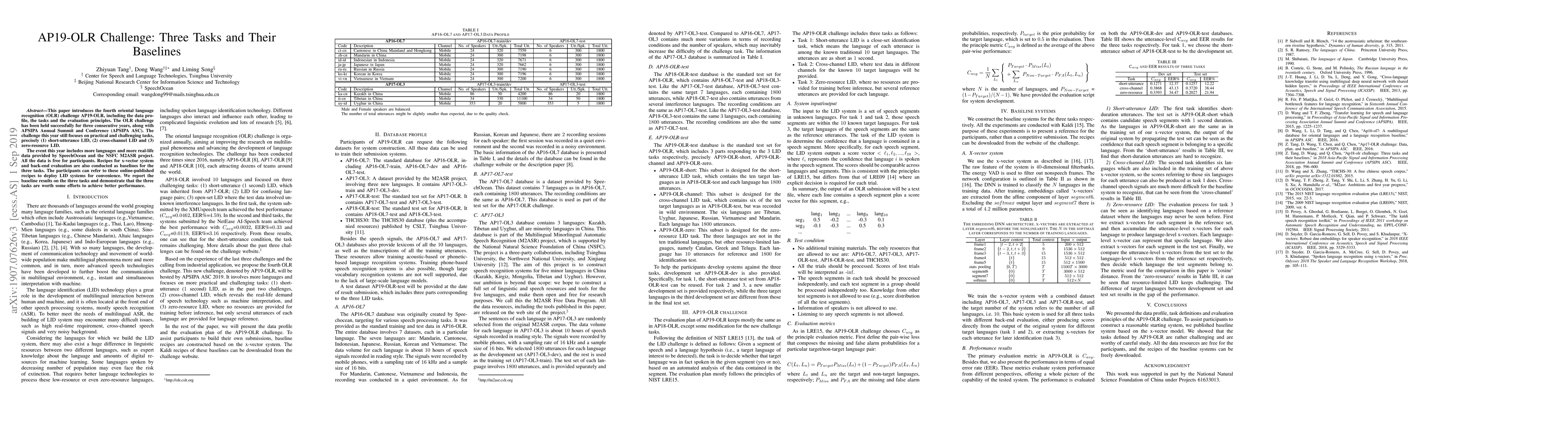 The AP19-OLR Challenge evaluates short-utterance, cross-channel, and zero-resource language recognition systems on practical tasks with real-life data. Baseline results show that these tasks are worth improving to achieve better performance.